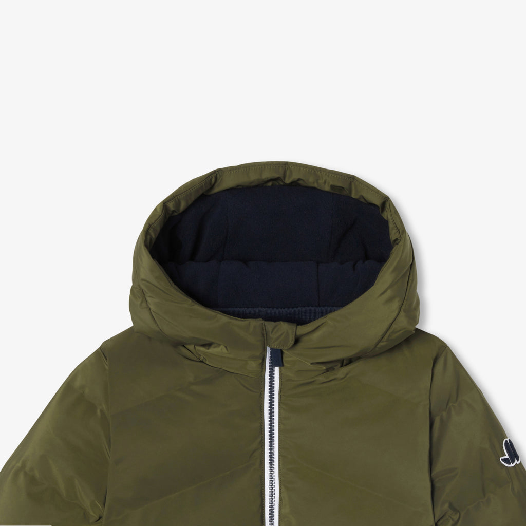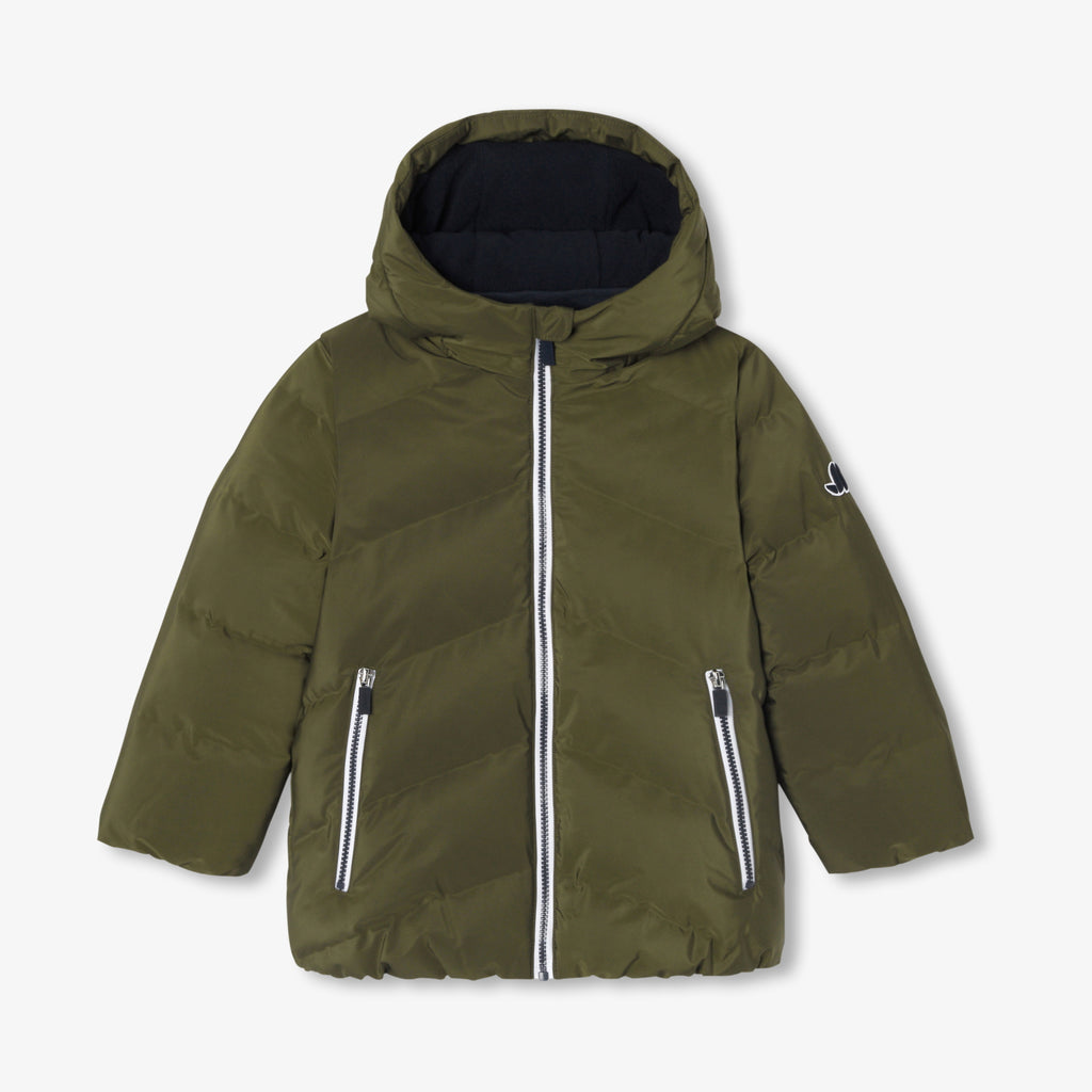 お子さまに大人気のミニマルでスポーティーシックなダウンジャケット。撥水加工のポリエステル製で、マイクロフリースの裏地付き。リサイクルポリエステルの中綿が快適な暖かさをキープします。ジャージーの縁取りの付いたファスナー式フードがアクセントに。秋から冬の寒さをしっかり防ぎ、街中でもスキー場でも活躍する都会的なシルエットの一着です。