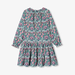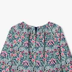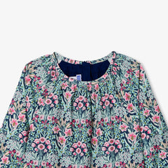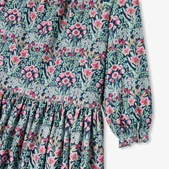 ロマンチックでカラフルな花の世界へと誘うワンピース。細かいコーデュロイ生地に魅惑的なリバティプリント(花柄)組み合わせました。ラグラン袖、ギャザーのディテール、伸縮性のある袖口がこの一着を引き立てます。秋にはタイツとブリティッシュコートを合わせて。