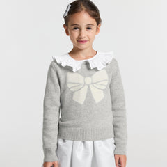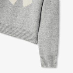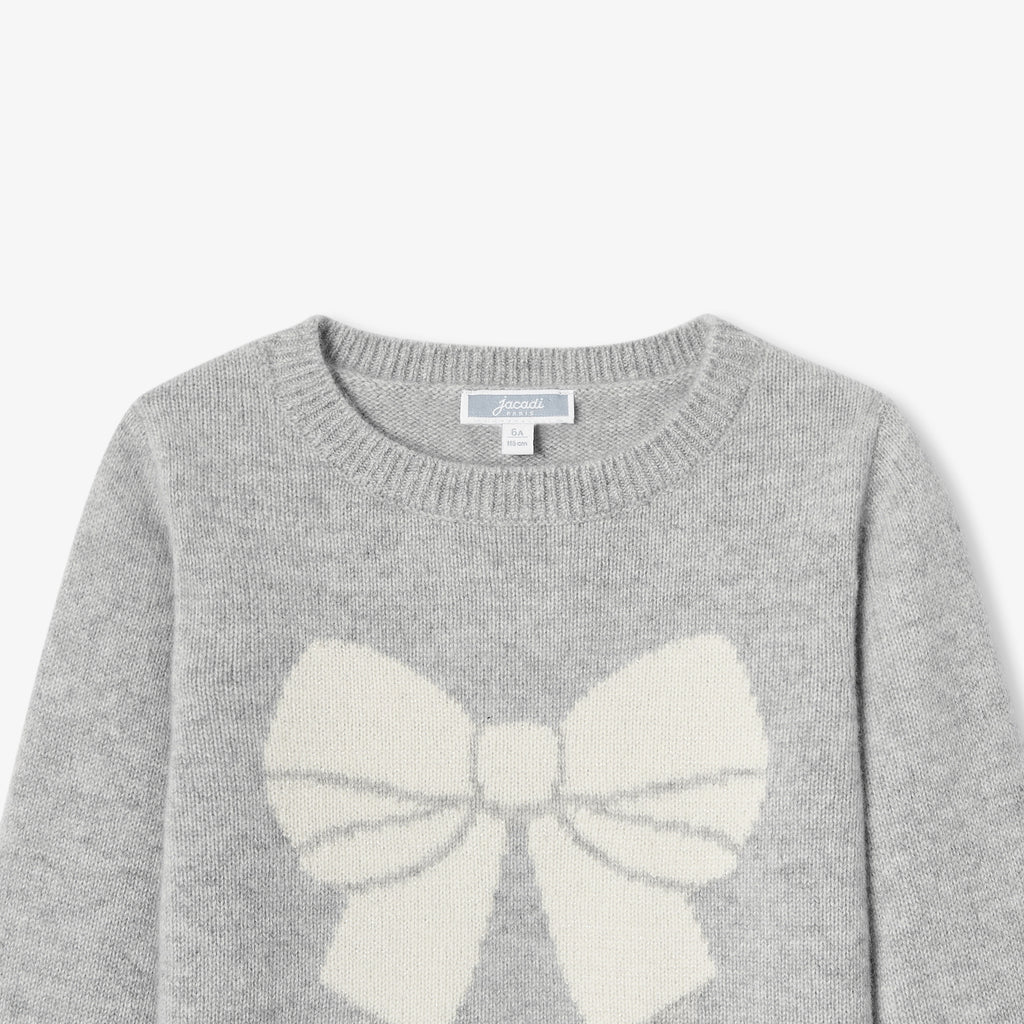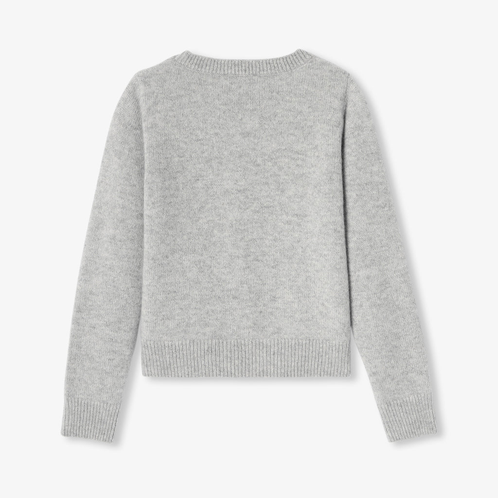 クリスマスの魔法にそっと寄り添うような、繊細なニュアンスが魅力のセーター。流行にとらわれないエレガントな色彩と柔らかく上質なカシミヤが特徴です。包み込むような着心地の厚手ニットに、ラメ入りのインターシャ織リボンモチーフが華やかなアクセントに。シックで構造的なラインが印象的なチュチュスカートと虹色のレザーシューズを合わせれば、ホリデーシーズンにふさわしい特別な装いが完成します。