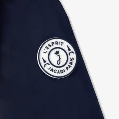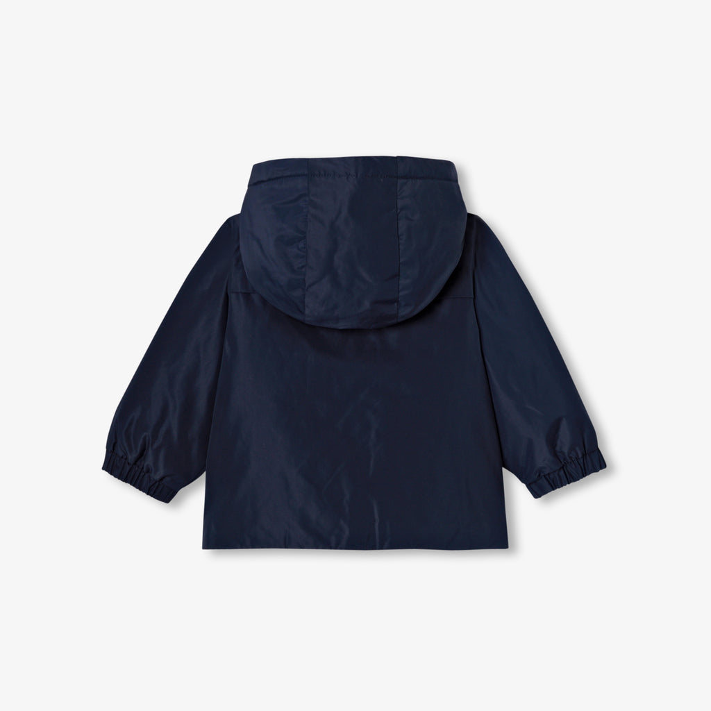 スタンドカラー(襟)にフード、ファスナー仕様で、天候の変化にも対応できる頼れる一着です。