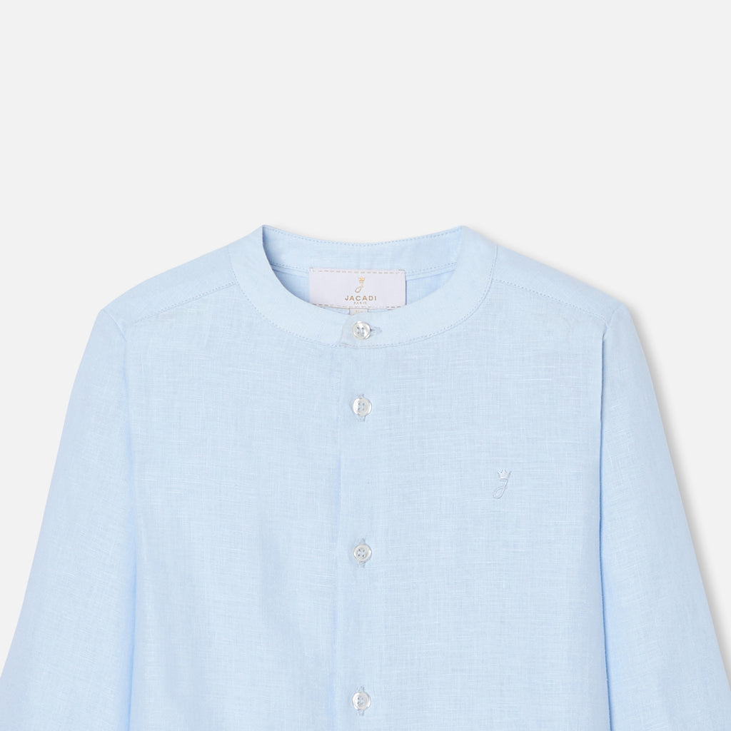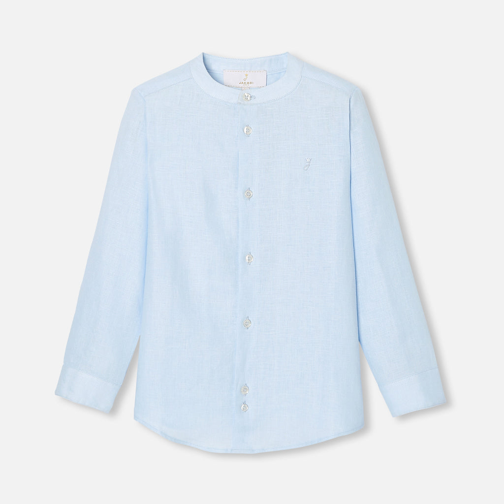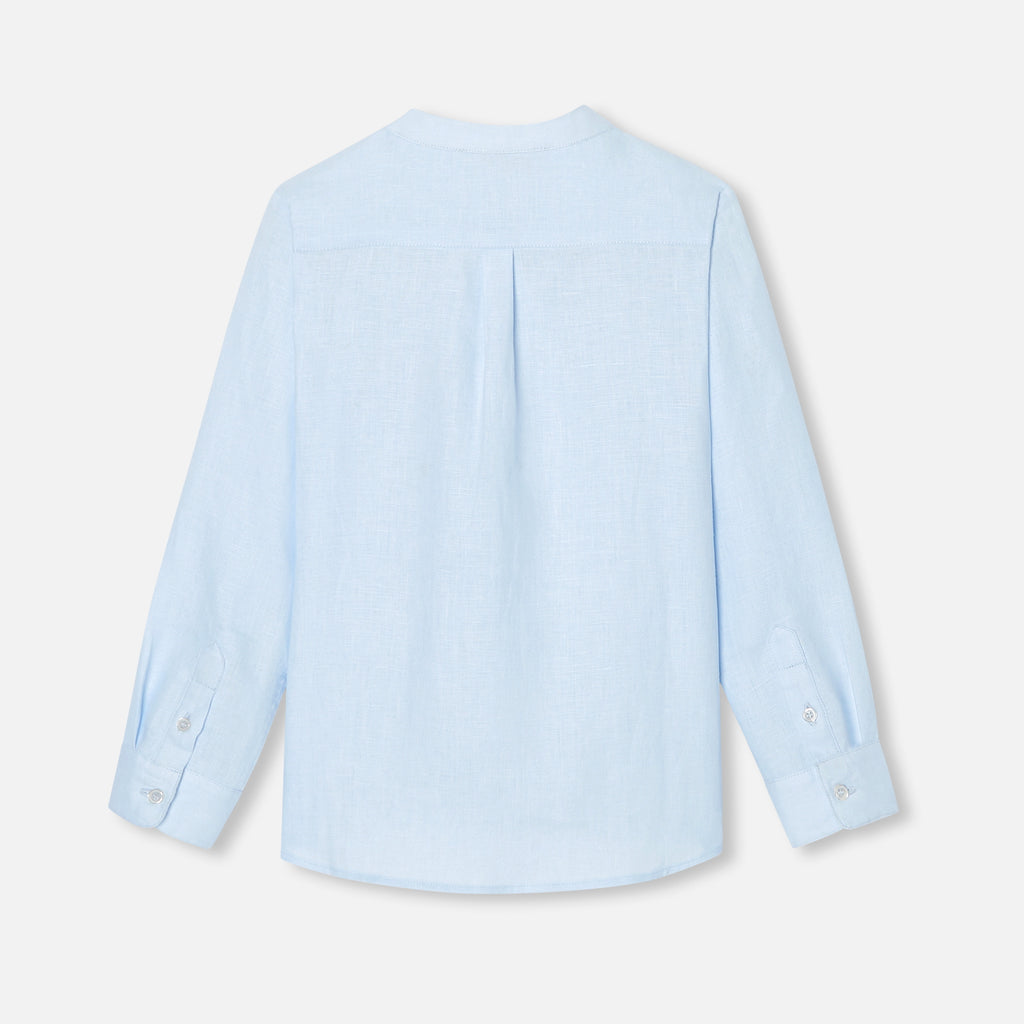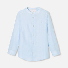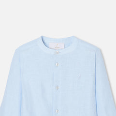 リネン生地に上品な立襟のボタンダウンシャツ。シンプルなデザインで合わせやすい一枚です。