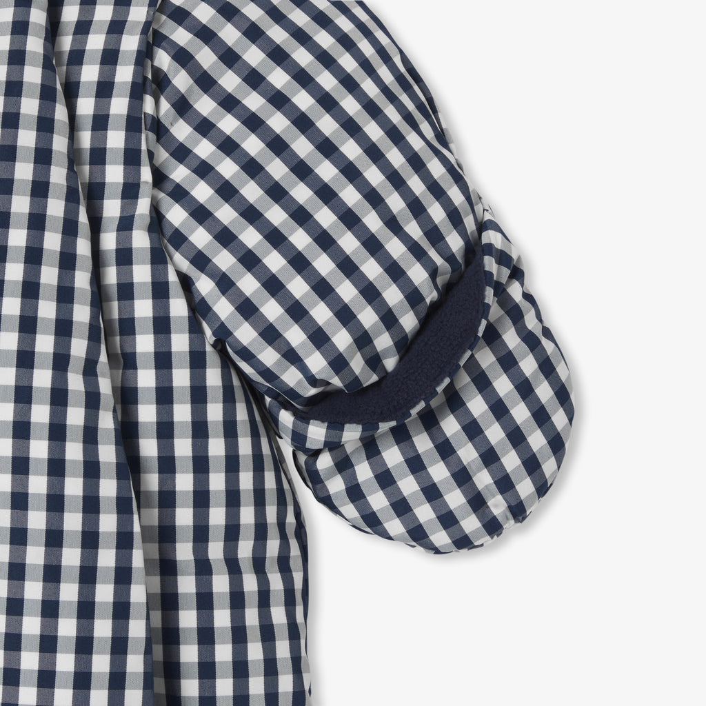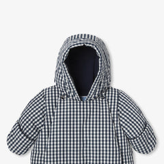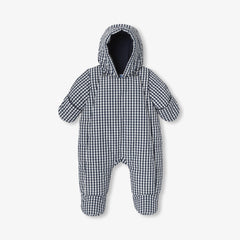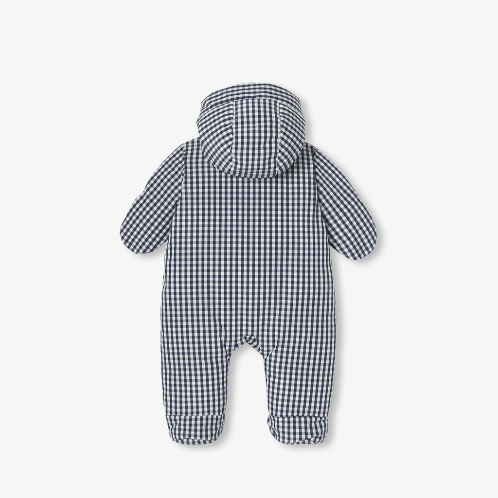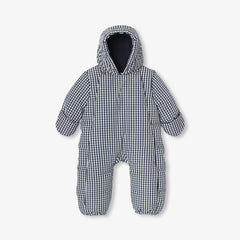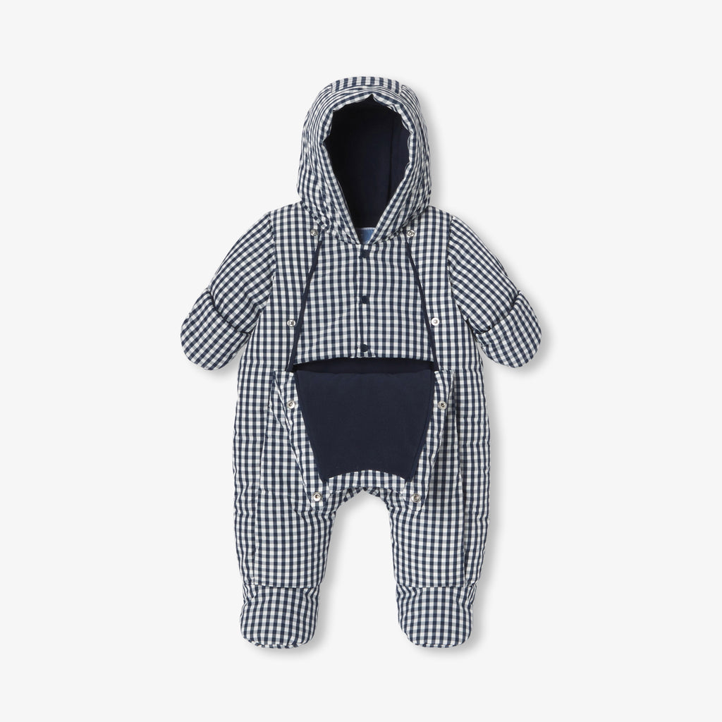お出掛け時に大活躍の撥水スノースーツ。暖かく包み込むような着心地と使い勝手の良さ、モダンなギンガムチェックが特徴の一着です。ダブルファスナー開閉で、赤ちゃんが寝たままでも座ったままでも、安心して着脱できます。足つきのモデルに、マイクロフリースの裏地とミトン手袋付き。冬の必需品になりそうです。