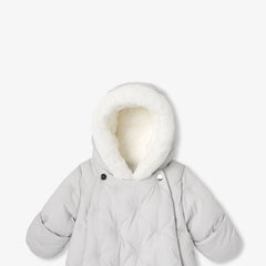 撥水加工を施したポプリンのスノースーツで暖かい冬を。マイクロフリースの裏地、フェイクファー裏地のフード、小さな王冠の刺繍が特徴的なワードローブの必需品です。寝たままでも座ったままでも、安心して着脱できるダブルファスナー開閉のデザインとなっています。ミトン手袋付きで、街中やスキー場などのあらゆるお出掛けに活躍しそう。