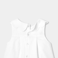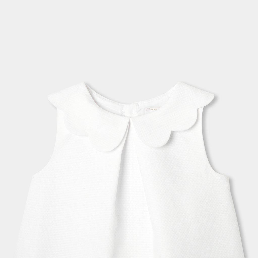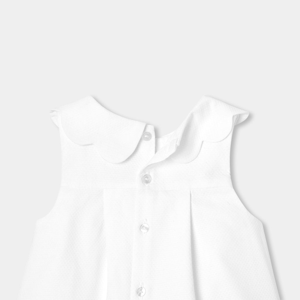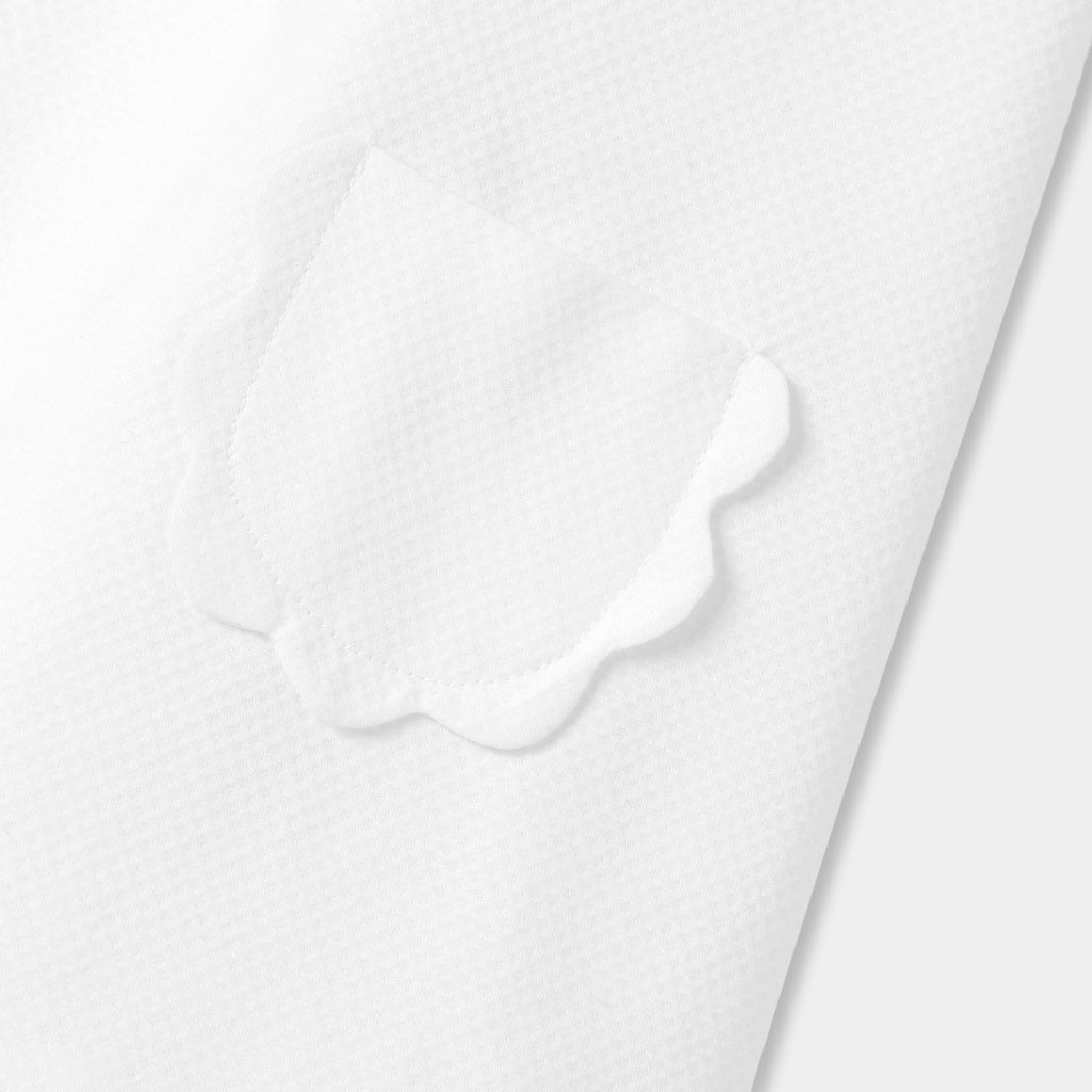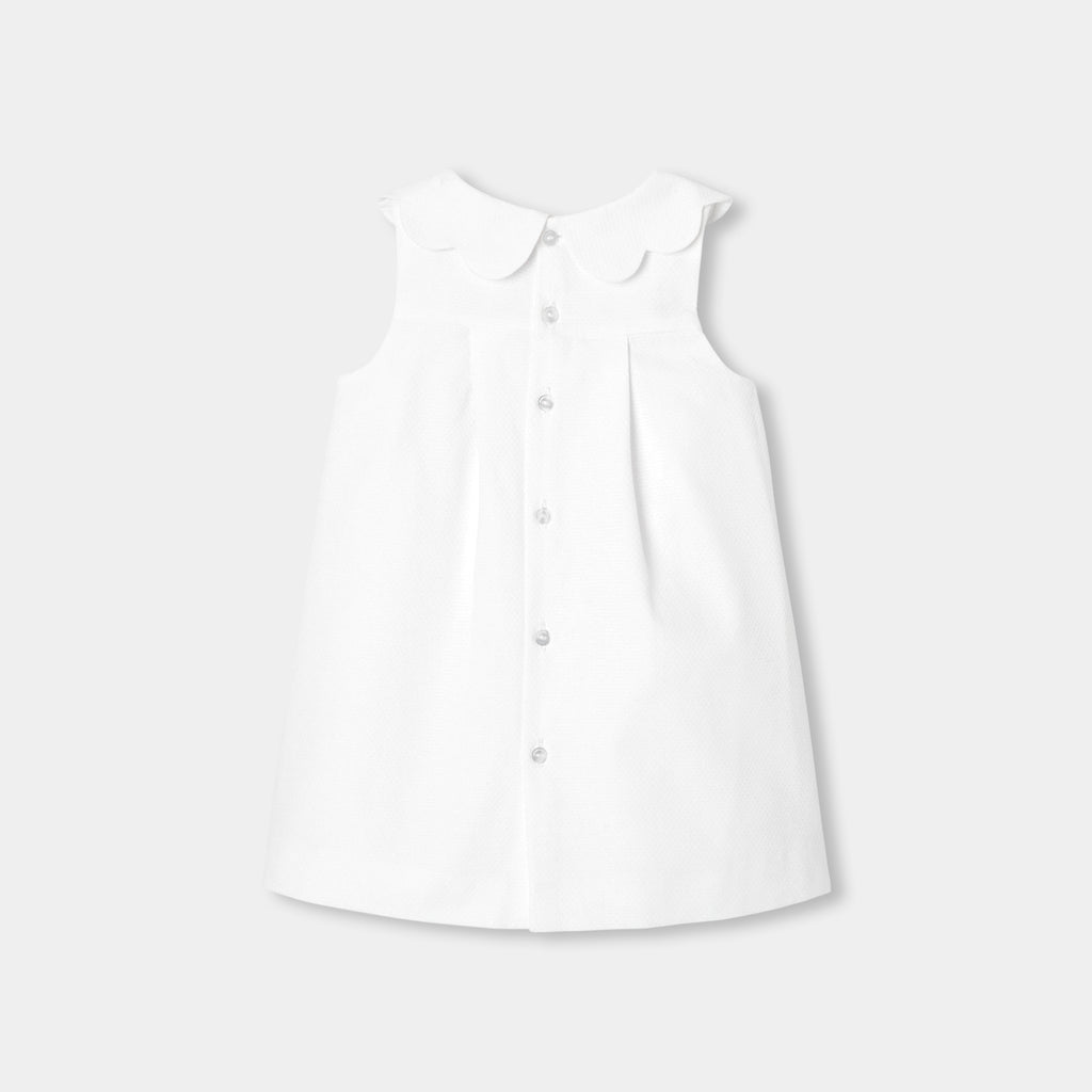 仕立ての美しさが際立つスタイリッシュなワンピース。美しいドレープを描くハニカム模様のコットンピケ素材を使用しています。Aラインシルエットに、スカラップ襟とスカラップで縁取ったパッチポケットをあしらいました。大切な思い出に残るシーンにふさわしい、レトロシックな一着です。