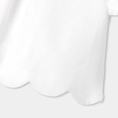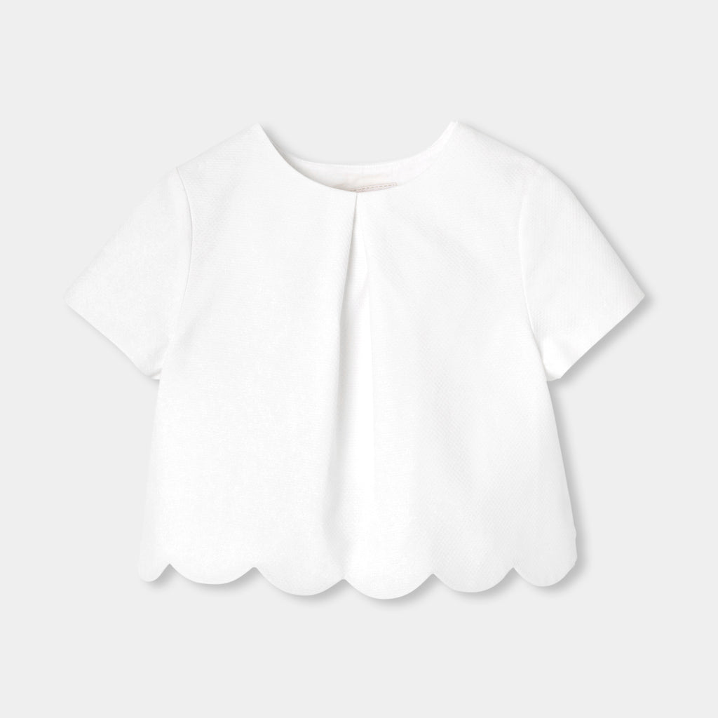 アイボリーホワイトで、ボックスプリーツとスカラップの裾が特徴。コレクション内の花柄キュロットや、お揃いのショートパンツ(別売り)にジャケットを合わせれば、洗練されたコーディネートが完成します。
