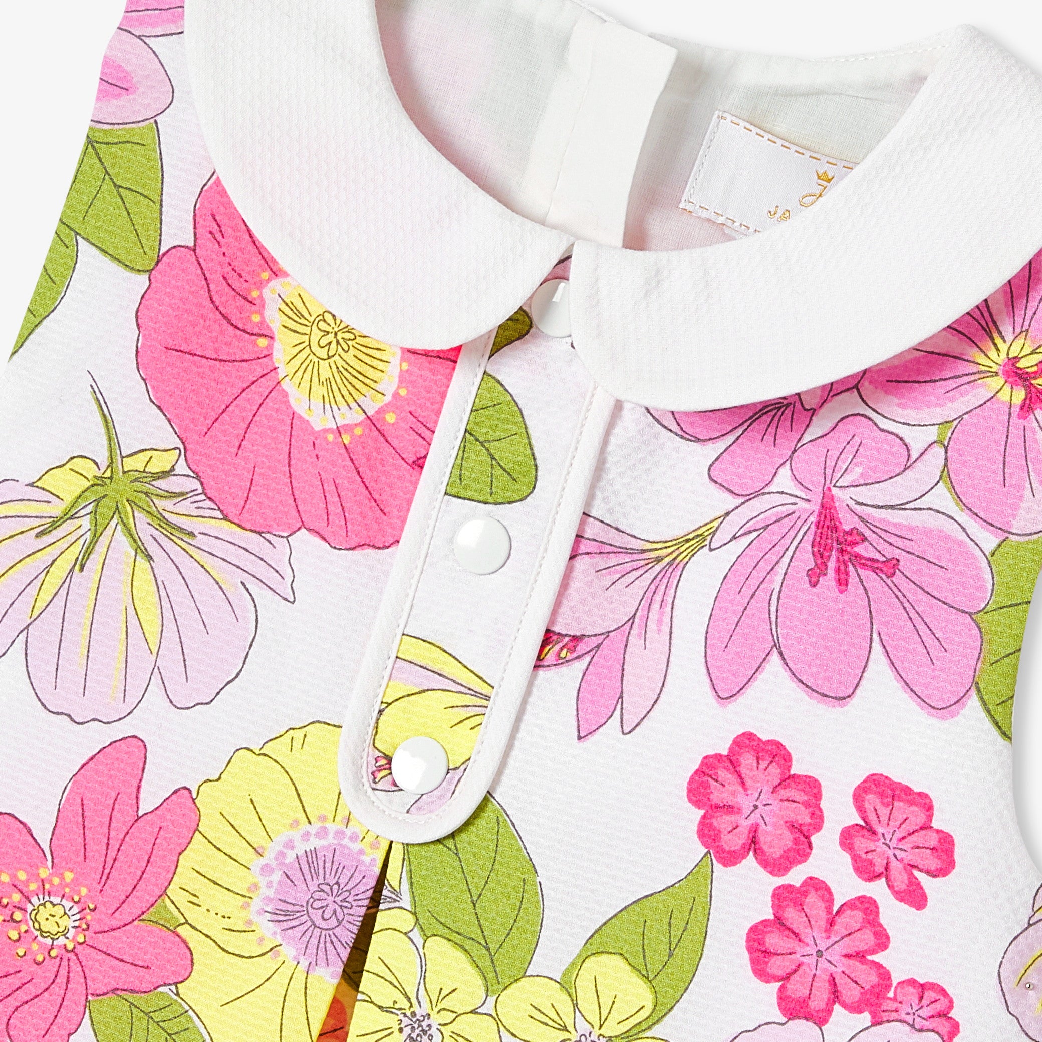 レトロシックで、牧歌的な雰囲気のワンピース。優雅なハニカムピケ地に花柄をふんだんに施しました。