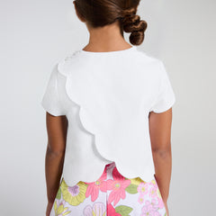 アイボリーホワイトで、ボックスプリーツとスカラップの裾が特徴。コレクション内の花柄キュロットや、お揃いのショートパンツ(別売り)にジャケットを合わせれば、洗練されたコーディネートが完成します。