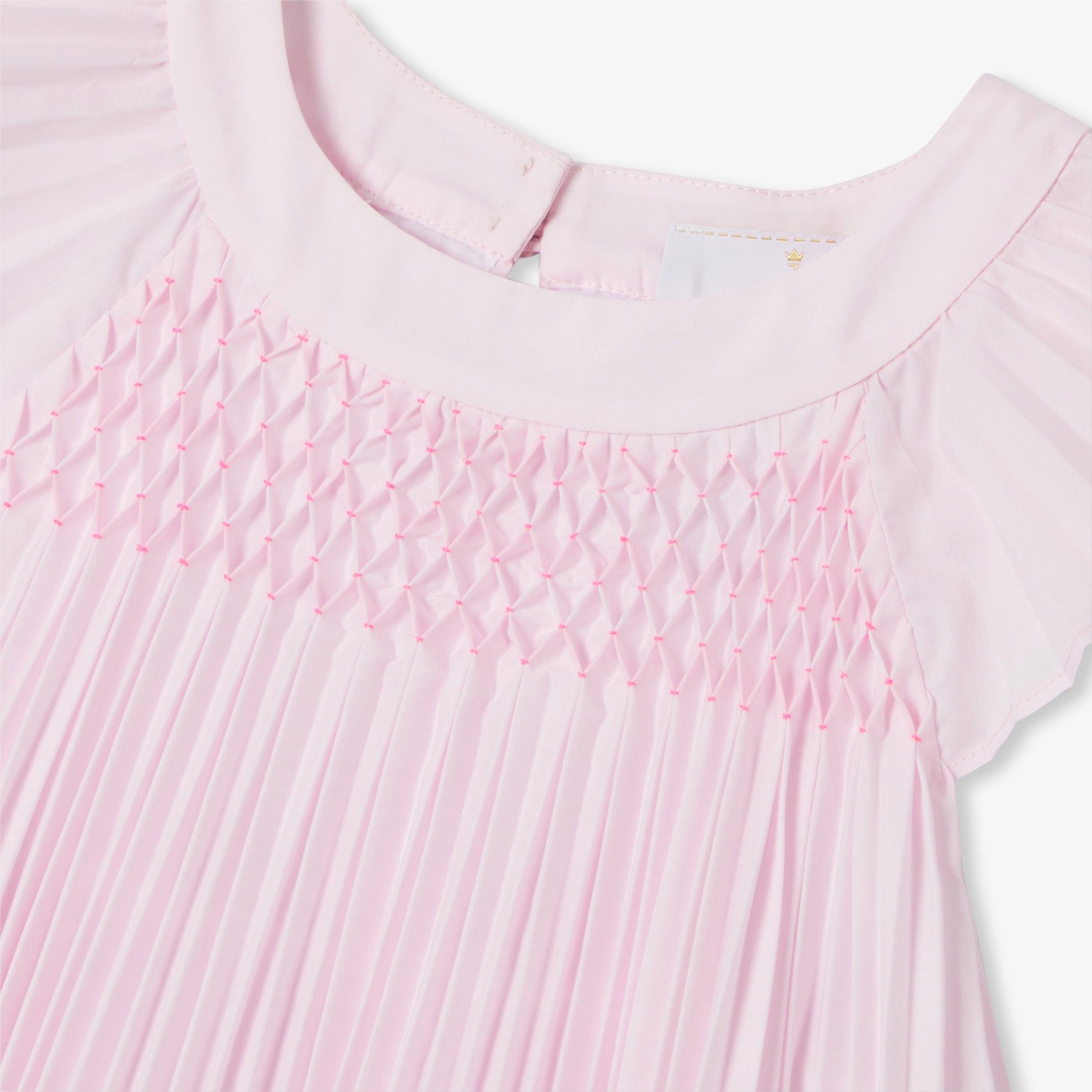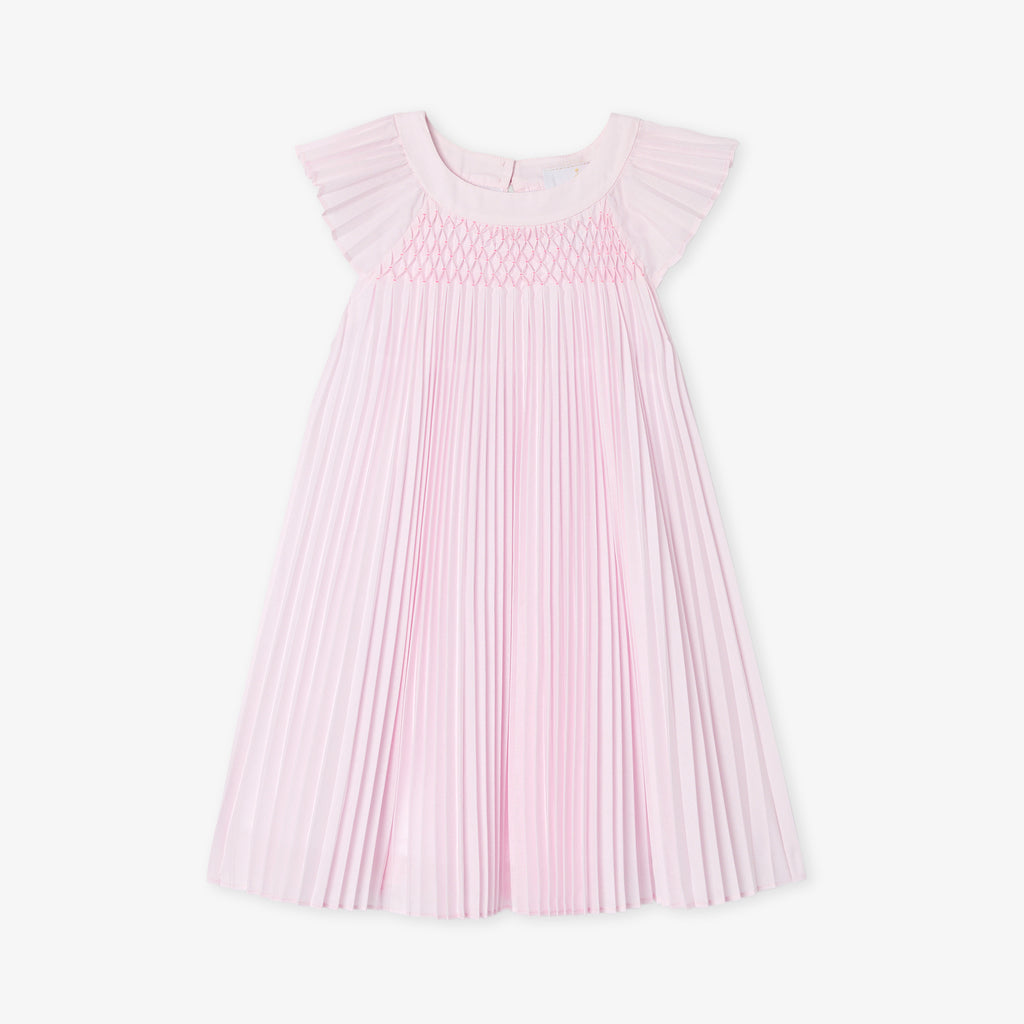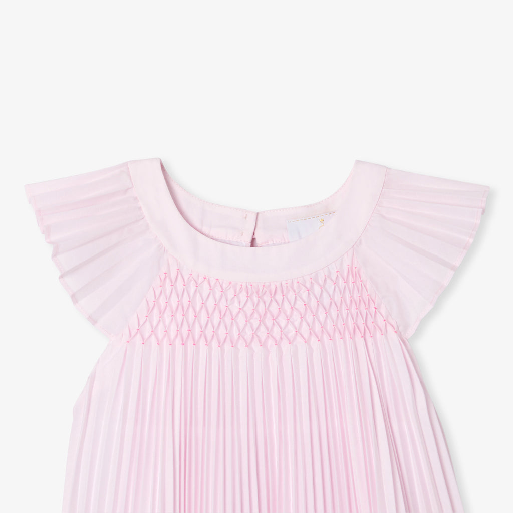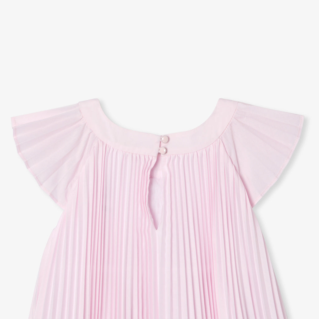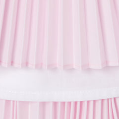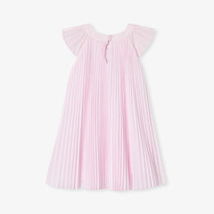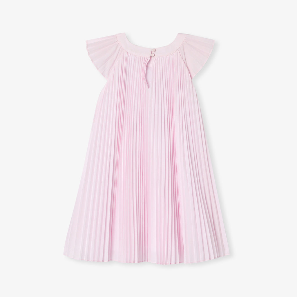 ネックラインに施された立体感のある刺しゅうプリーツとフリル袖が印象的な、グラフィカルな一着です。カチューシャやサンダルと合わせれば、フォーマルスタイルが完成します。