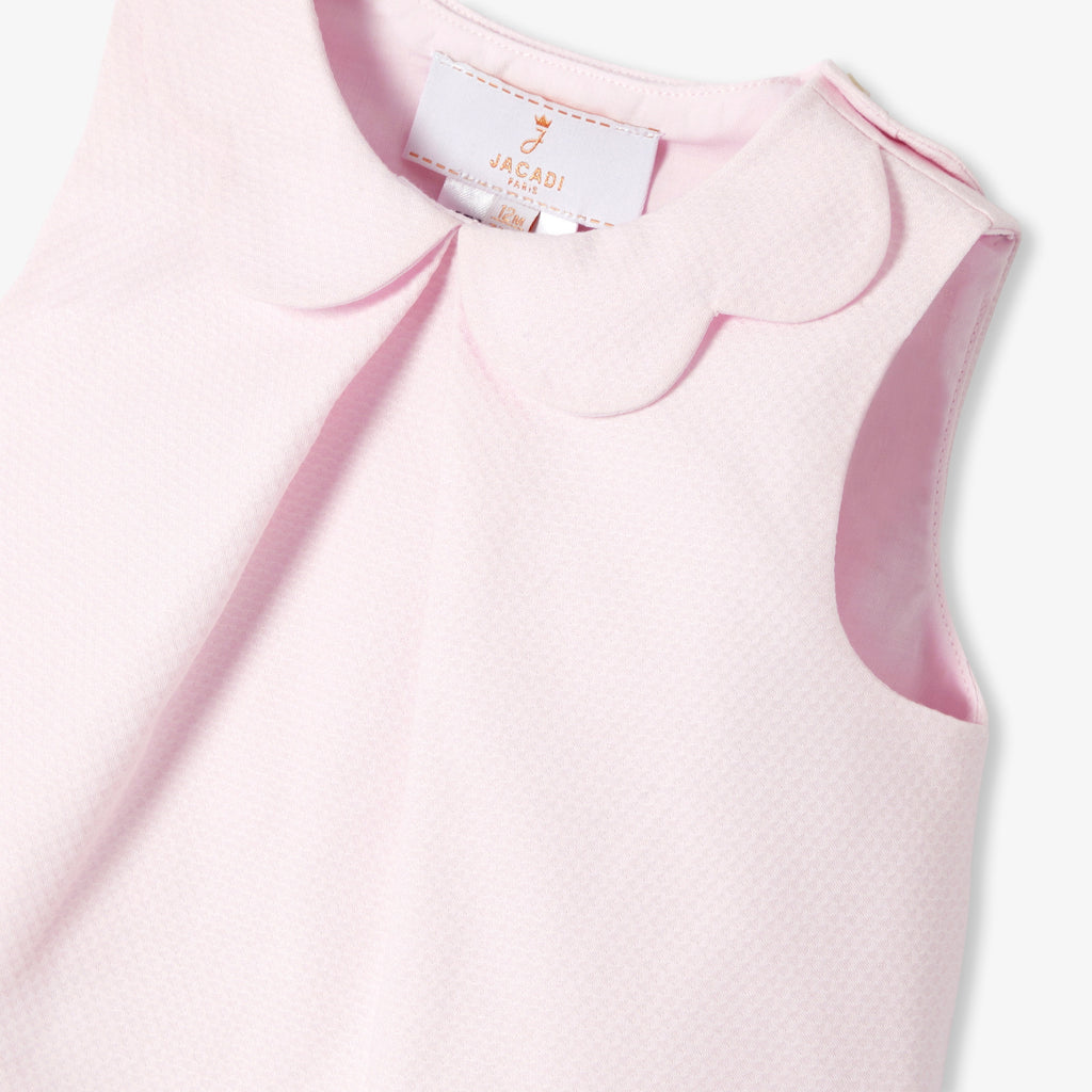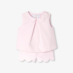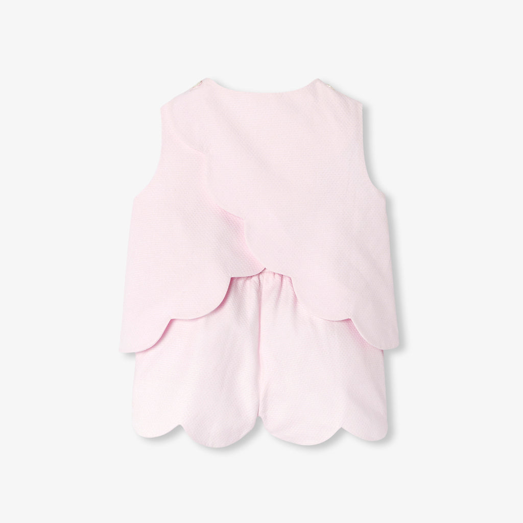 ジャカディらしい洗練されたハニカムコットンピケ素材のエレガントなアンサンブルです。スカラップ襟のバッククロスデザインのトップスと、スカラップのショートパンツのセット。真夏にぴったりの、さまざまなシーンで活躍する一着です。