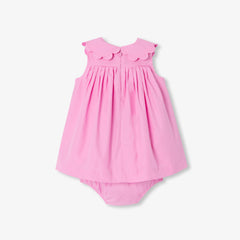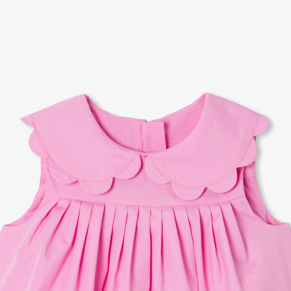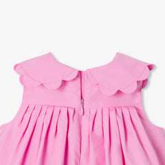 凛とした印象のエレガントなピンクが美しい、コットンポプリンの特別な日のためのワンピース。ジャカディらしいペタルカラー(襟)に、ウエストのプリーツが描く洗練されたラインがモダンな印象の一着。可愛らしいサンダルや帽子と合わせるのがおすすめです。