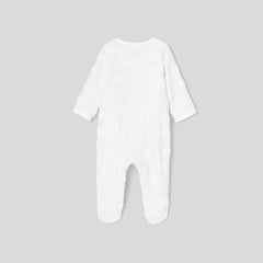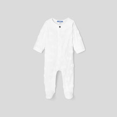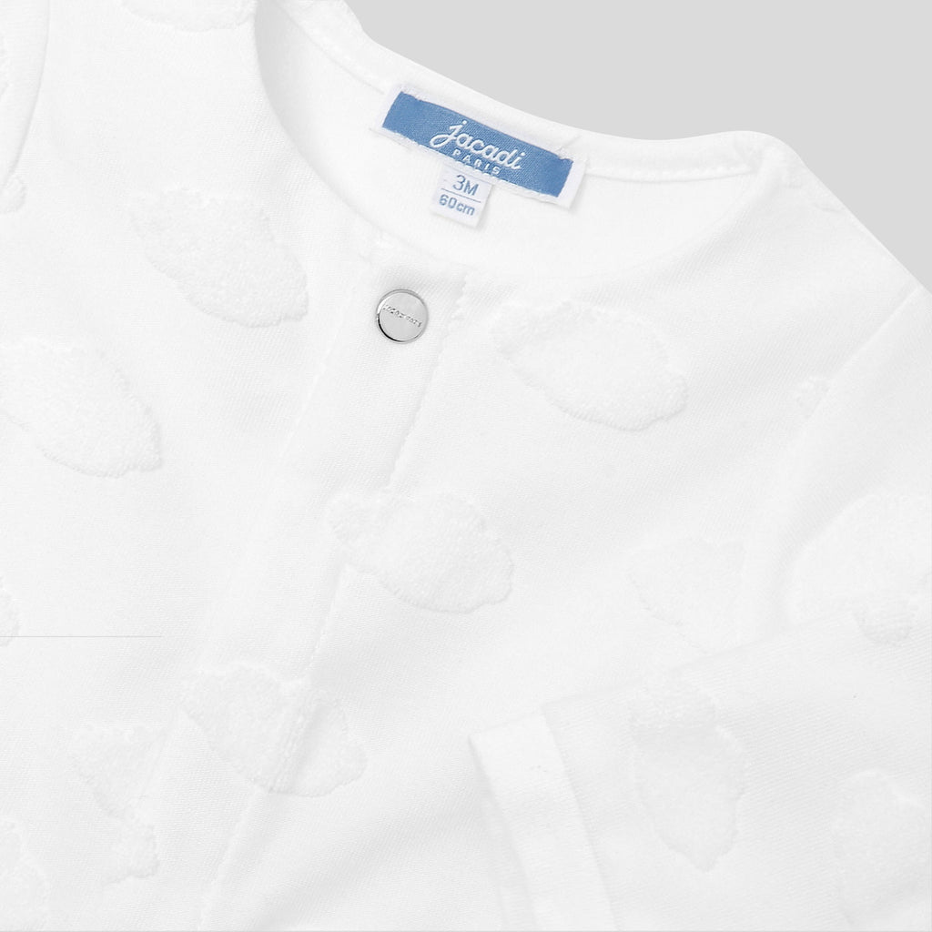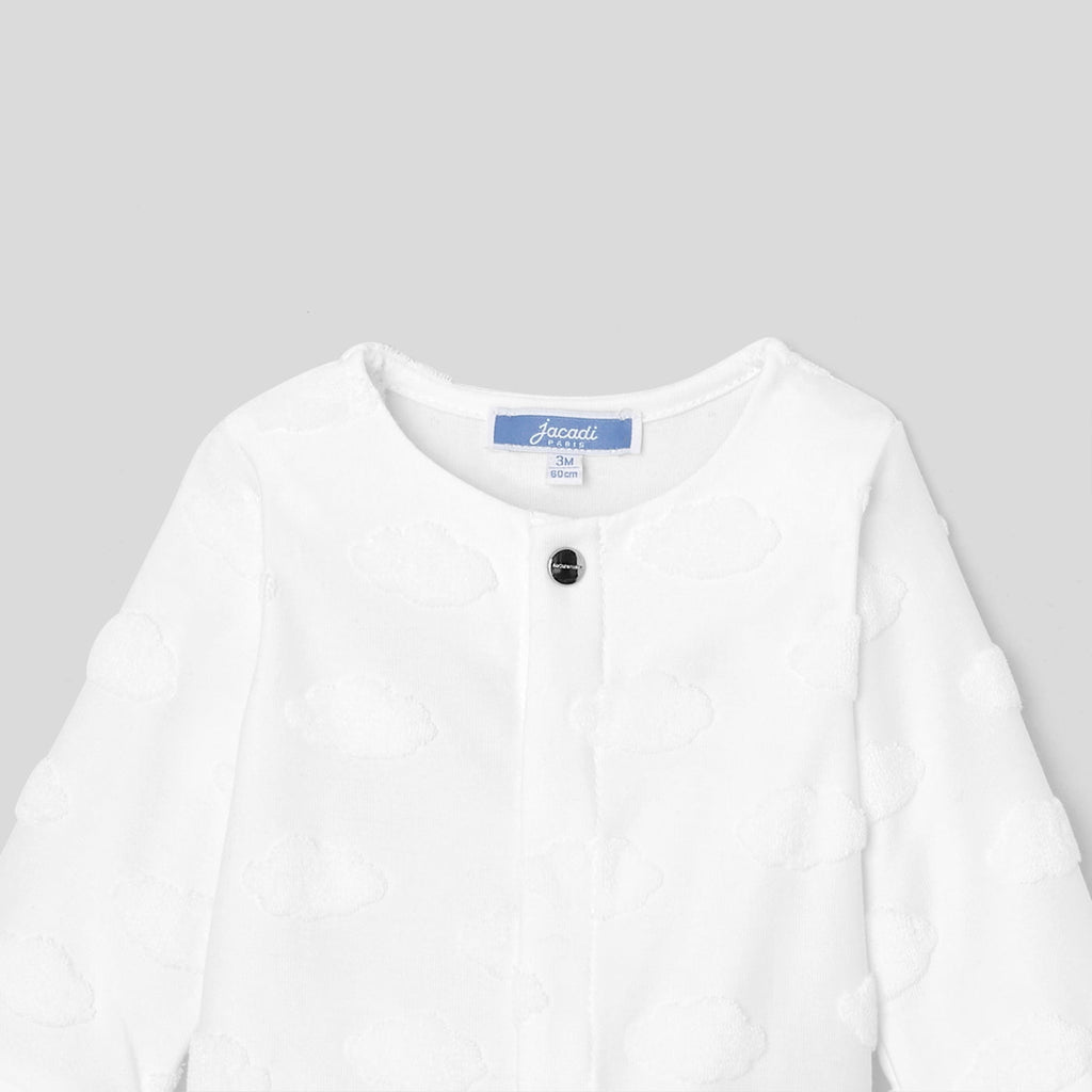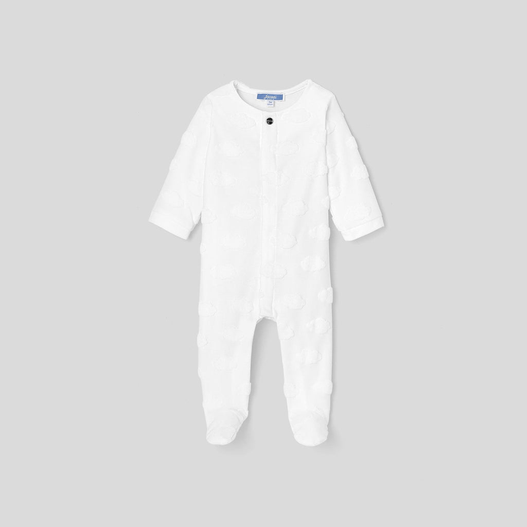 フロッキー加工の雲のデザインが散りばめられた足つきロンパース・パジャマ。オーガニックコットンのジャージー生地で着心地良く、赤ちゃんのお休み時間にぴったりです。