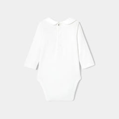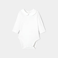 コットンピケのピーターパンカラー(襟)をあしらった、長袖ボディスーツ。柔らかでしなやかなオーガニックコットンを使用しており、洗練されたラインが美しいモデルです。ロンパースやニットロンパースとの相性も抜群。