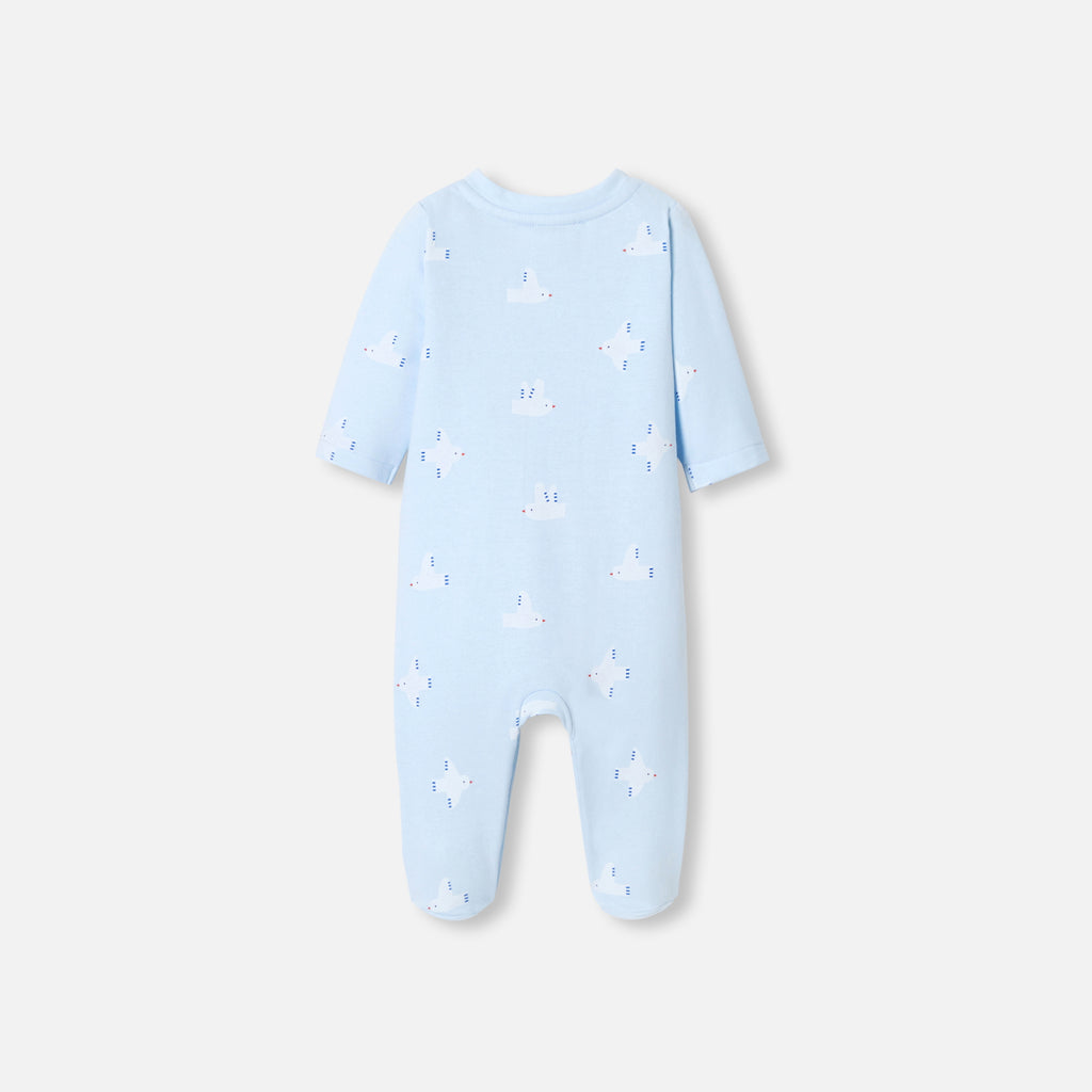 赤ちゃんを柔らかく快適に包み込む、裏起毛フリースの足つきロンパース・パジャマ。カモメのプリントが可愛らしく、前開きで着脱も安心。赤ちゃんの初めてのワードローブにぴったりで、ご出産後からすぐにお使いいただけます。