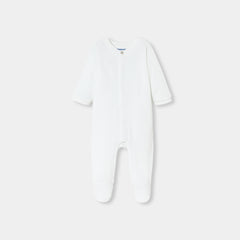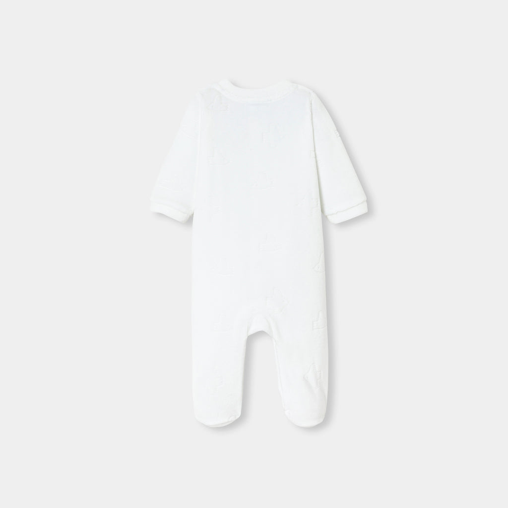 オーガニックコットン製のベロア調生地を使用した、柔らかな足つきロンパース・パジャマ。オリジナリティあふれるカモメのモチーフが魅力的で、ご出産後からすぐにお使いいただけます。丸襟と正面のスナップボタンで、着脱も安心・簡単。赤ちゃんのワードローブの必需品で、ご自宅用にもギフトにもおすすめです。