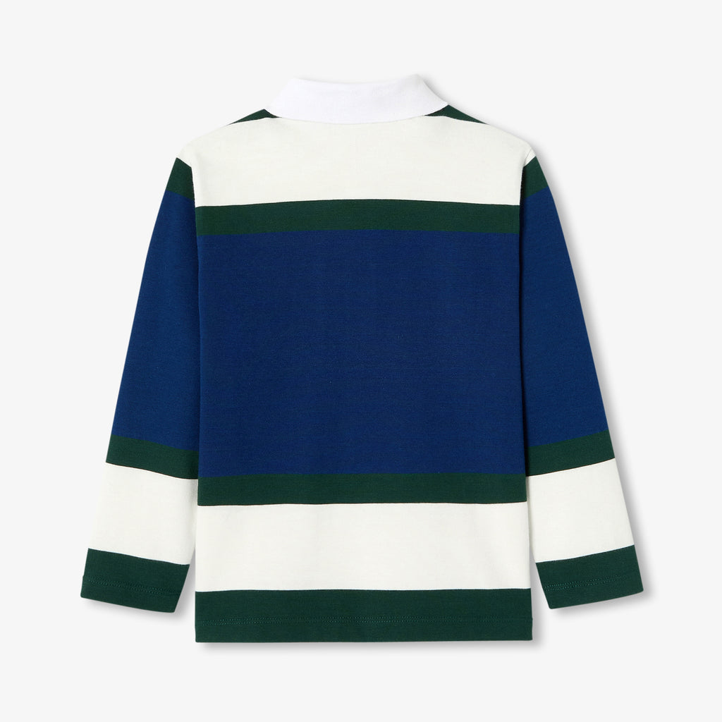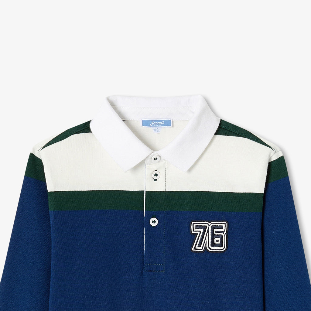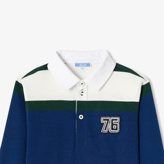 キャンパス風のラガーポロシャツ。スポーティーでカラフルなプレッピースタイルを演出します。柔らかく着心地の良いヘビーコットンのジャージー素材を使用しました。アシンメトリーなストライプがモダンです。ジャカディブランドの誕生年である"76"の刺しゅうバッジ付き。ベロアパンツやスウェットパンツと合わせて、普段着やスポーツシーンにもぴったりです。