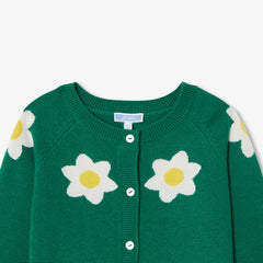 レスポンシブルウールとカシミヤで仕立てたカーディガン。ネックラインにインターシャ織のエレガントな花をあしらっています。同系色のボタン開閉で着脱も簡単。ワンピースや襟付きTシャツに合わせれば、シックでプレッピーなシルエットが完成します。