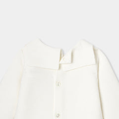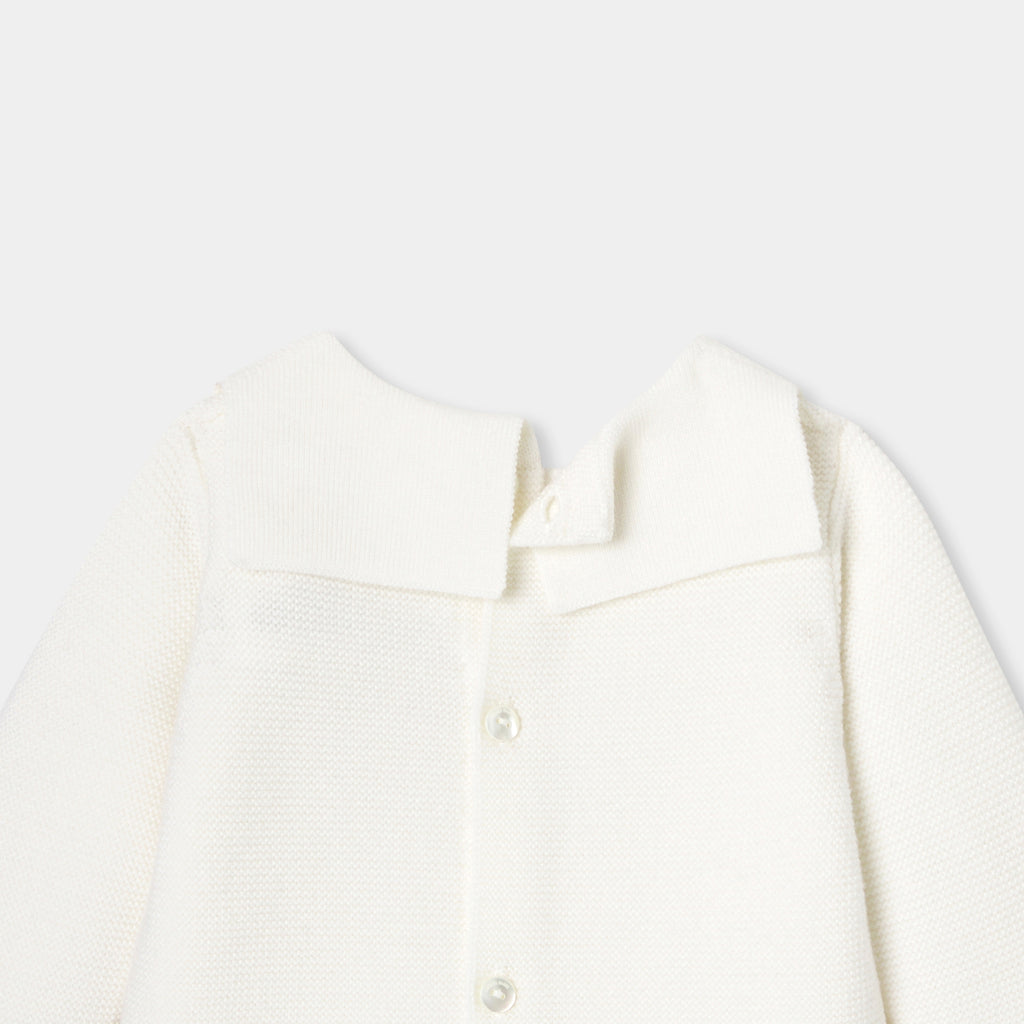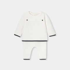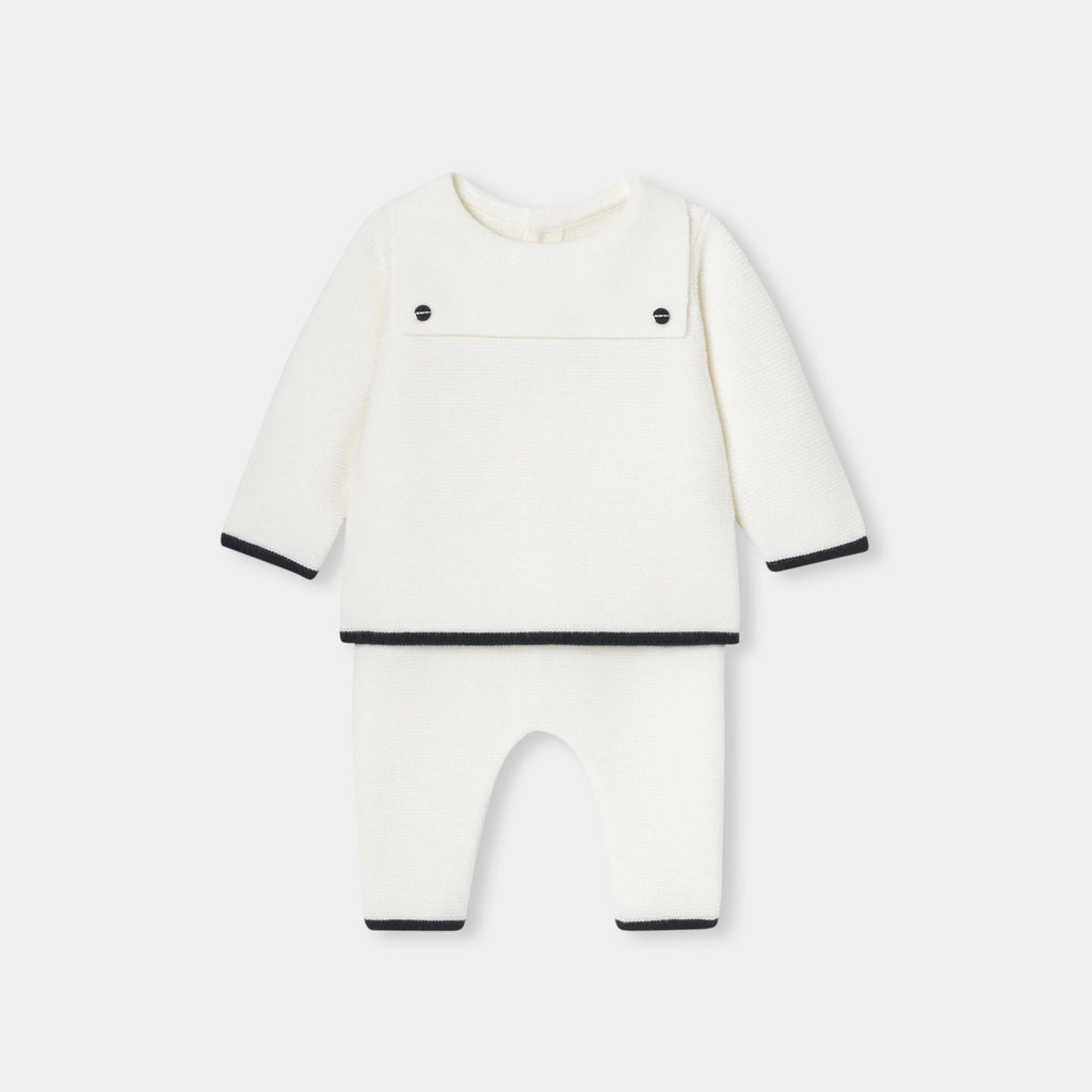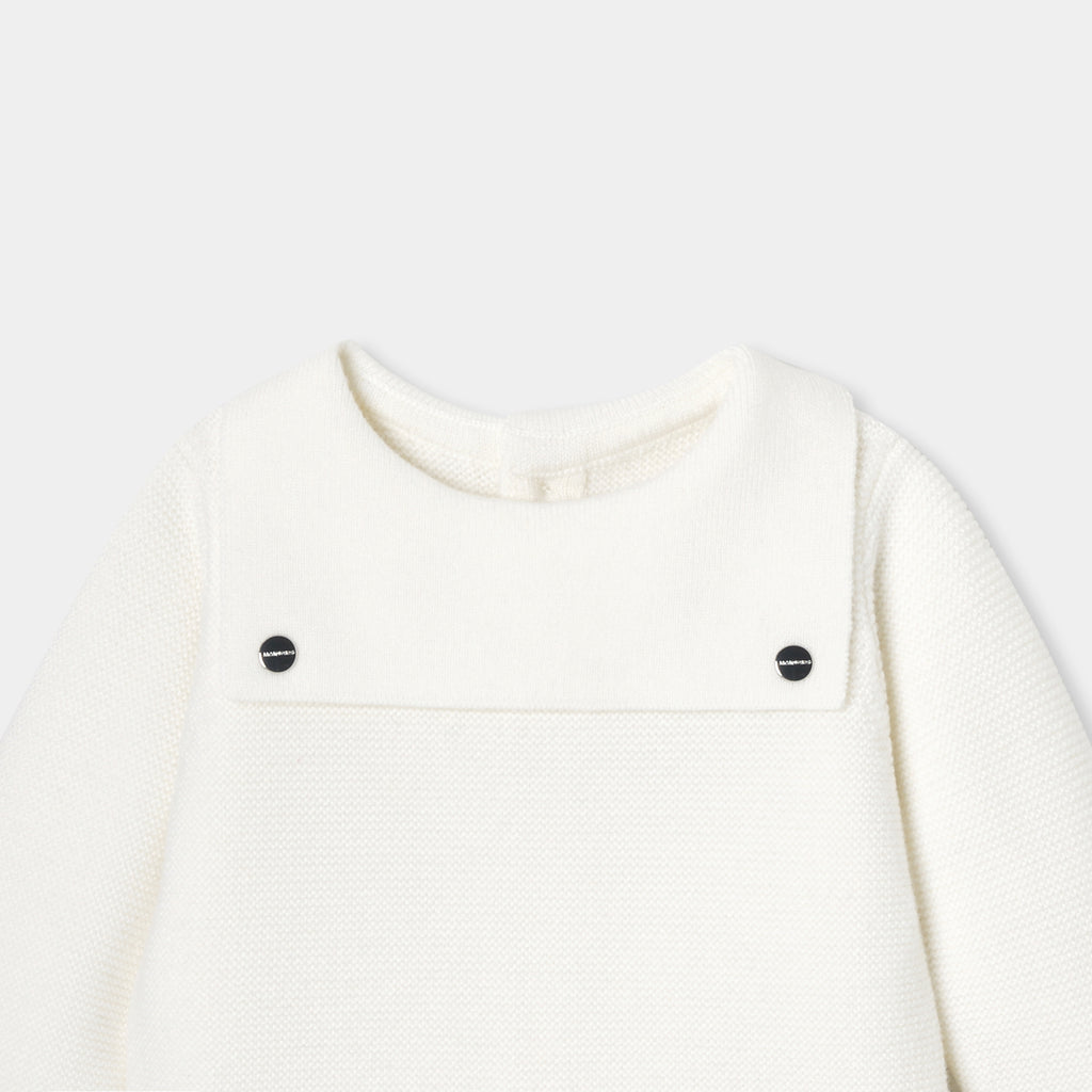 柔らかで暖かなレスポンシブルウールを使用した、シックなアンサンブル。海辺をイメージさせるデザインで、セーラーカラー(襟)付きのセーターと柔らかなパンツが上下セットになっています。飾りスナップボタンとコントラストの効いたディテールがタイムレスな印象に。ご家族で長く着ていただける、ご自宅用にもギフトにもおすすめのアイテムです。