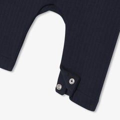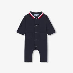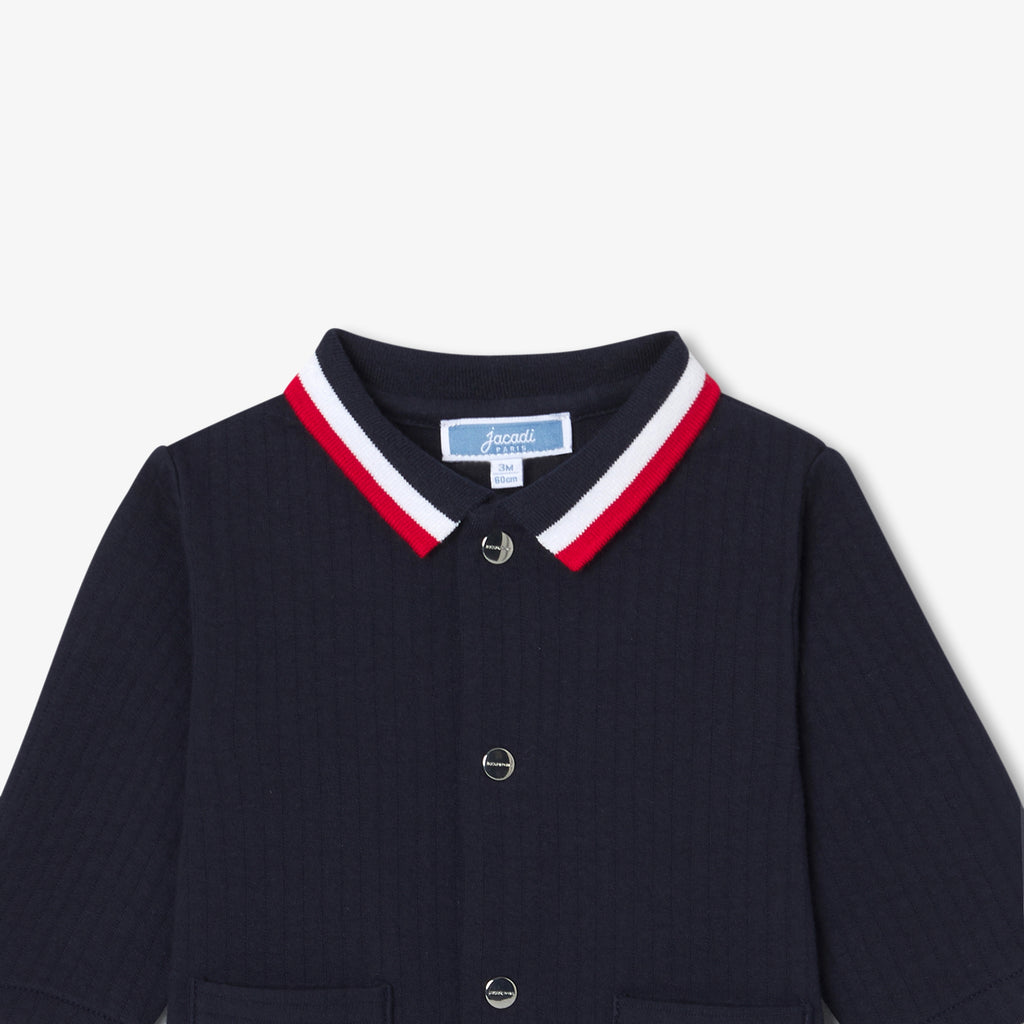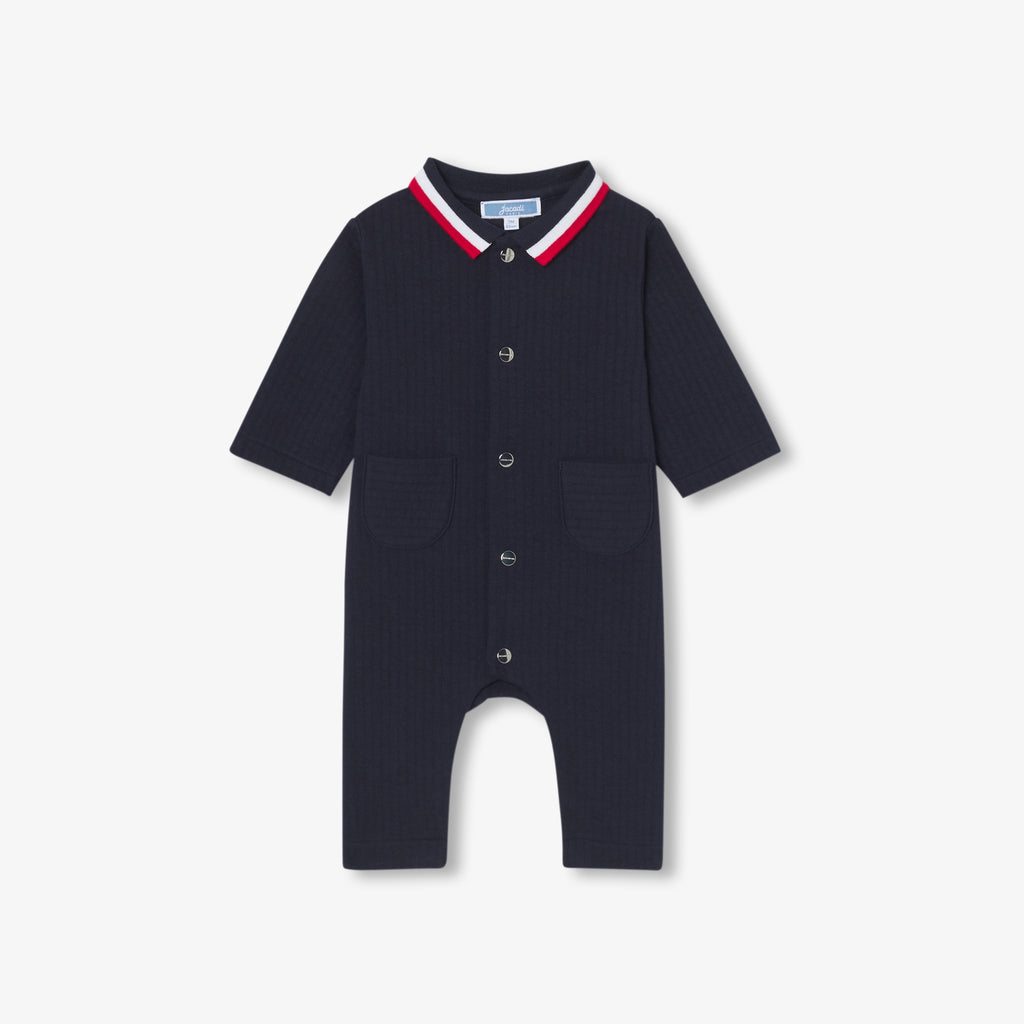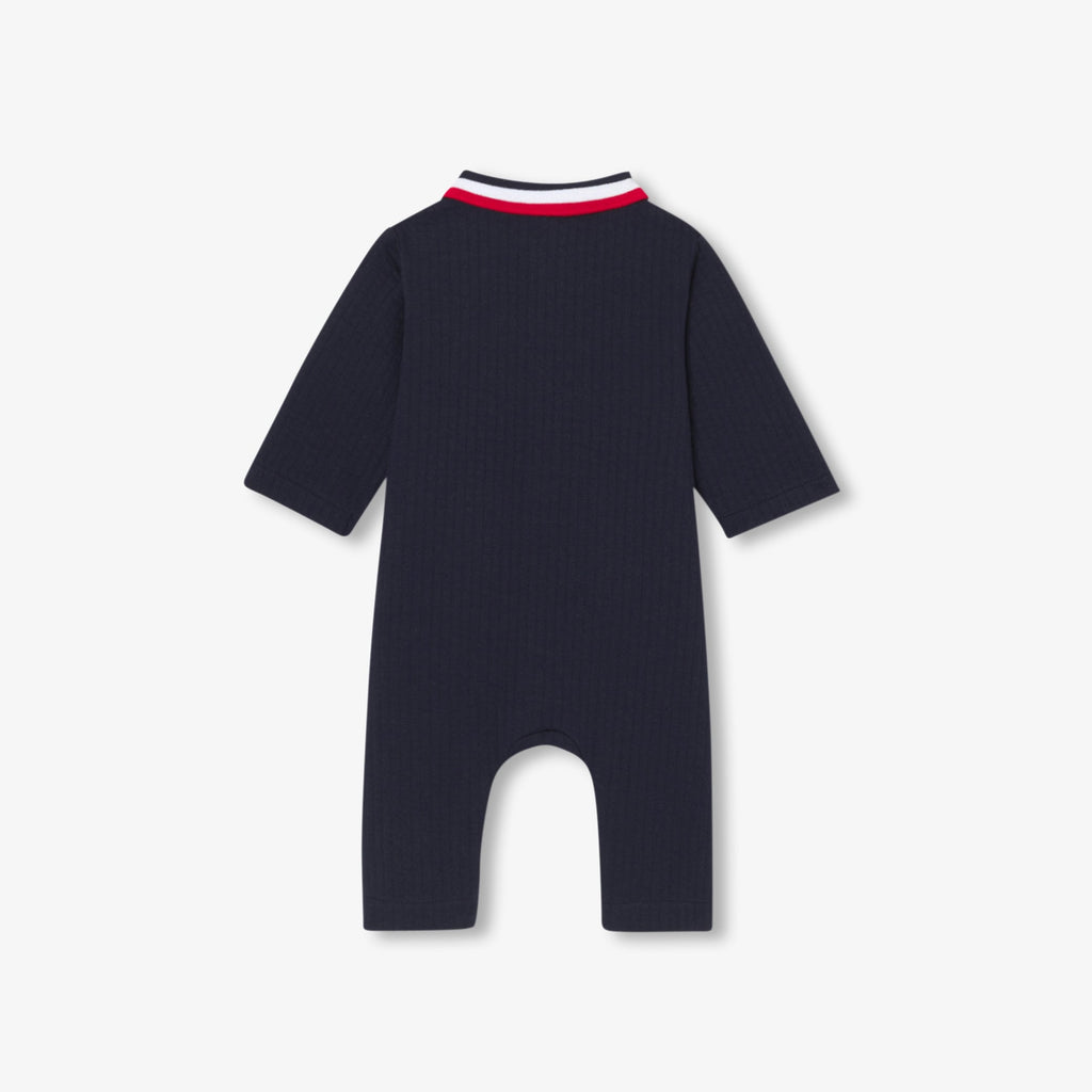 デイリーユースにぴったりのスポーティーシックで都会的なロンパース。柔らかでしなやかなキルティングのジャージーを使用したパリらしさあふれるモデルで、パッチポケットとストライプのポロ襟がアクセントになっています。ご家庭や保育園で重宝しそう。