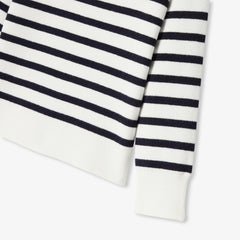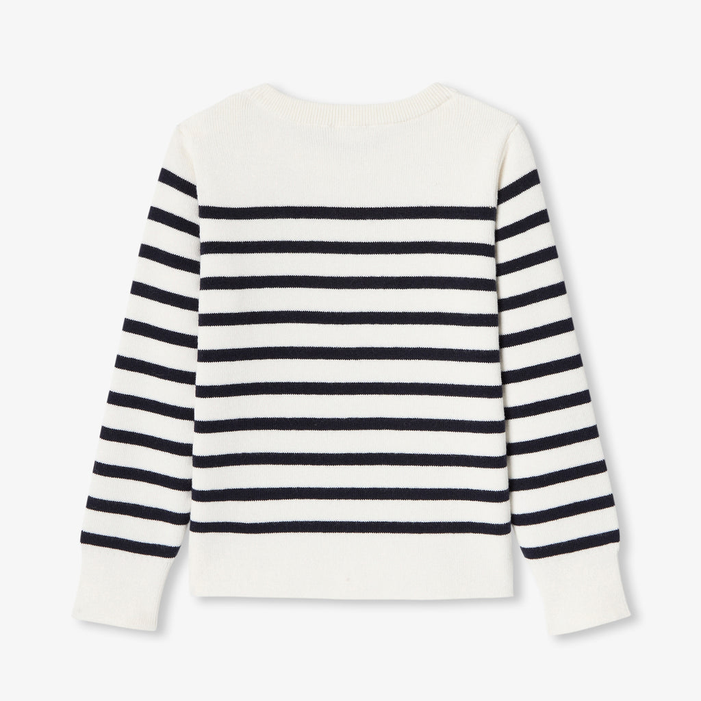 秋にぴったりな、オーガニックコットンとウールを使用したプレッピーなカレッジ風セーター。肩のスナップボタンで着脱も簡単。ストライプ柄、"J"と花の刺しゅうが入ったバッジがモダンです。着回しも抜群。ワイドレッグのジーンズにギンガムチェックのダウンジャケットを合わせて。