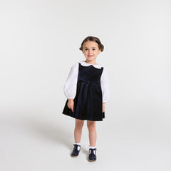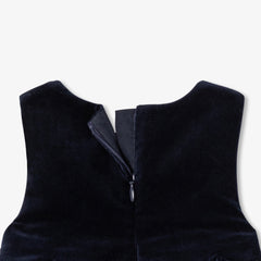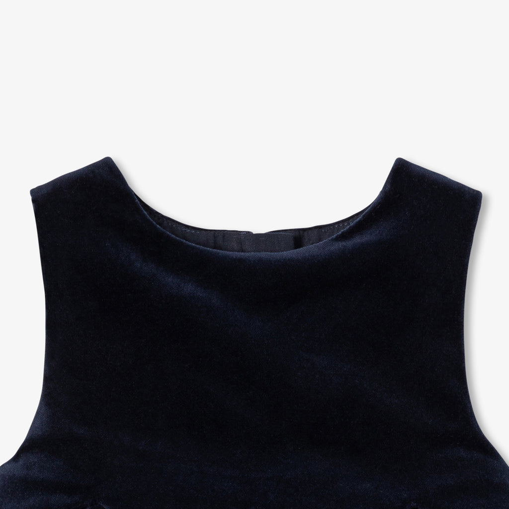ホリデーシーズンにぴったりの、なめらかなベロア調生地のノースリーブワンピース。シックでモダンな雰囲気を演出します。ウエスト部分に美しいスカラップを施したノースリーブデザイン。繊細なギャザーが、ふんわりとしたシルエットを生み出します。ボディスーツやブラウスの上に重ねて、特別な日にふさわしいエレガントな装いに。
