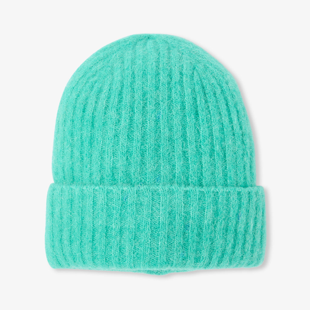ウールとアルパカの新しい毛糸を使った、ふんわりとした帽子。ソフトなグリーンが魅力的です。リブニット素材で折り返し付き。マイクロフリースの裏地が最高の肌触りを実現した、ミニマルなデザインです。スヌードと手袋と合わせて。