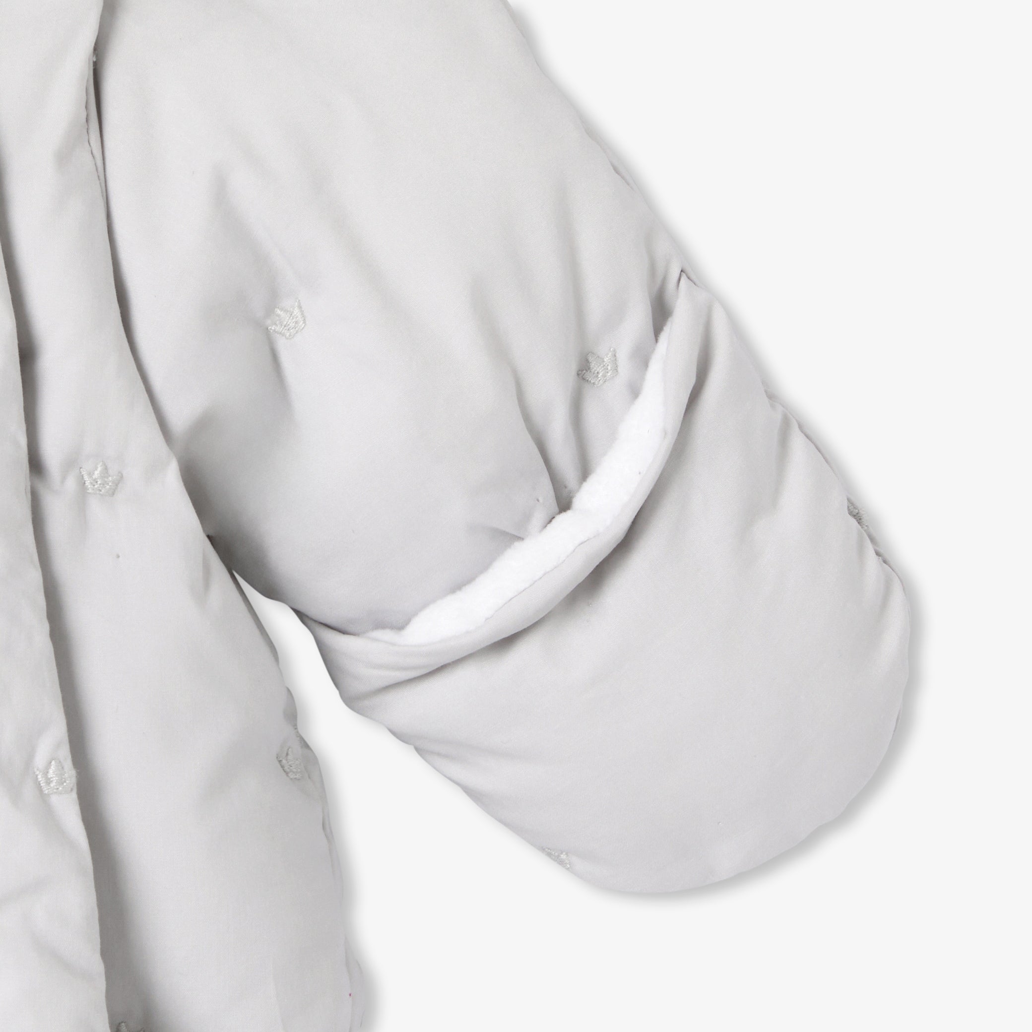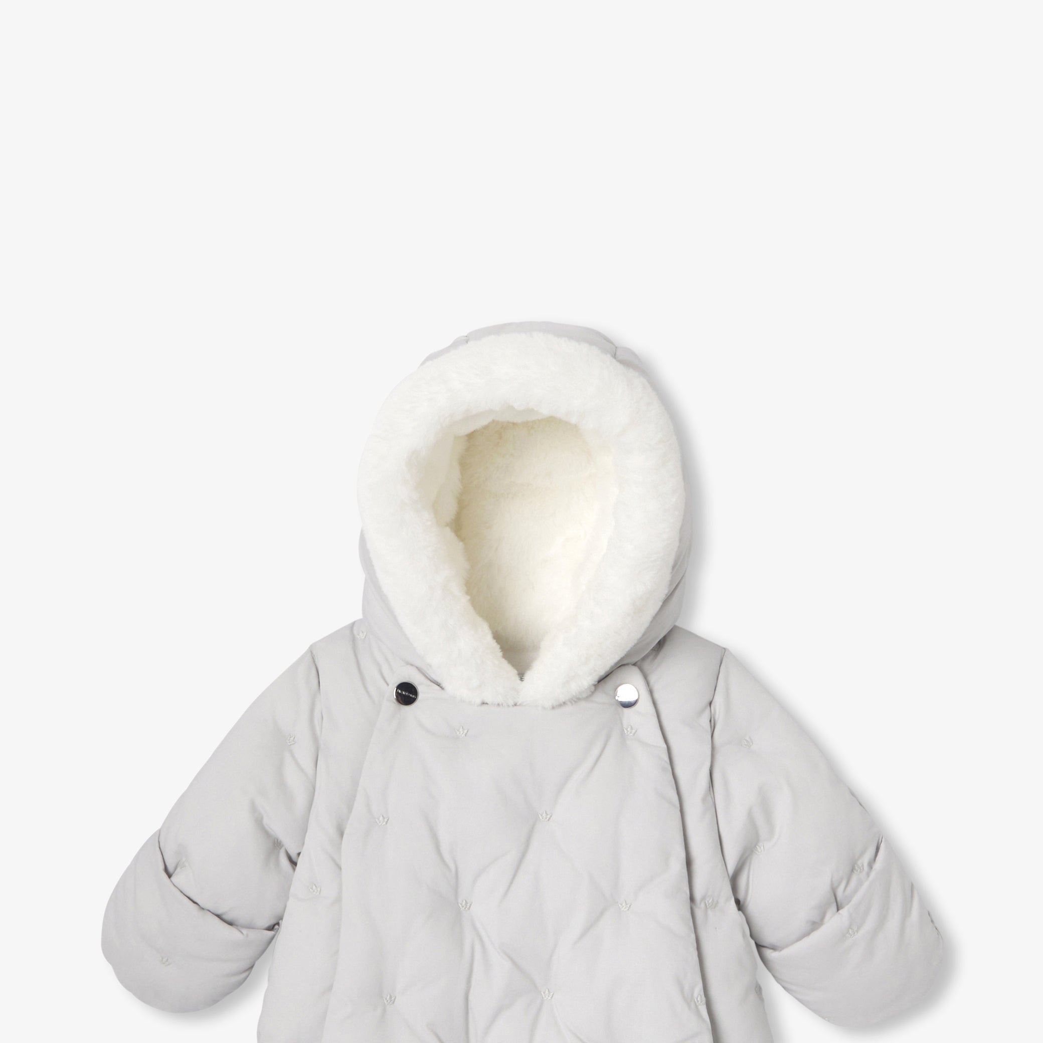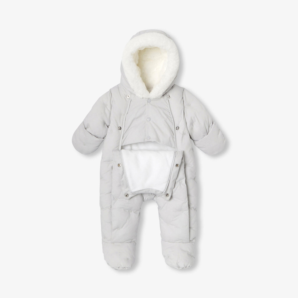 撥水加工を施したポプリンのスノースーツで暖かい冬を。マイクロフリースの裏地、フェイクファー裏地のフード、小さな王冠の刺繍が特徴的なワードローブの必需品です。寝たままでも座ったままでも、安心して着脱できるダブルファスナー開閉のデザインとなっています。ミトン手袋付きで、街中やスキー場などのあらゆるお出掛けに活躍しそう。