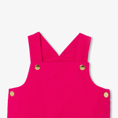ベロア調生地のワンピースを、新しい季節にリニューアル。ややドロップウエストでモダンに仕上げました。裾にプリーツを入れ、ダンガリー風のストラップをあしらいました。明るい色合いのブラウスやセーラー服と合わせれば、シックでパリらしいシルエットに。