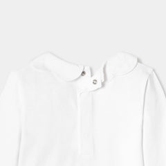 毎日を明るくエレガントに彩る、オーガニックコットンジャージーTシャツ。スカラップ襟に施した遊び心のあるモチーフは、小さなお子さまを喜ばせること間違いなし。背面開きで、着脱も簡単なマストアイテムです。ベロア調生地のショートパンツとカラフルなカーディガンを合わせて。