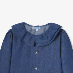 プレッピーで都会的なシルエットのデニム製ブラウス。アイコニックで万能のアイテムです。襟とスナップボタン留めがアクセントに。ワイドレッグジーンズと合わせたトータルコーディネートはもちろん、ワンピースやベロアスカートとも相性抜群です。