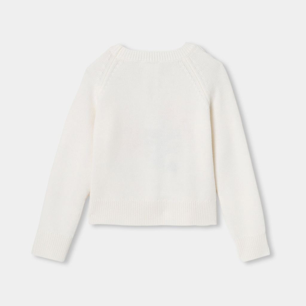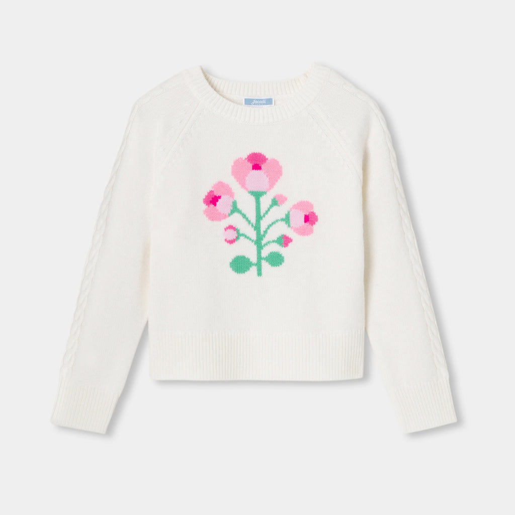 居心地のよいロマンチックな世界へと誘うセーター。冬のマストアイテムです。柔らかく保温性の高いウールを使用し、インターシャ織のアールヌーボーの花のブーケと、袖のツイストが魅力の一着です。ヘリンボーンのショートパンツやベロアパンツに合わせれば、どんな装いにもシックなアクセントを添えてくれます。