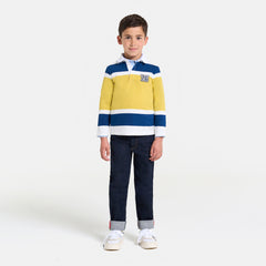 キャンパス風のラガーポロシャツ。ススポーティーでカラフルなプレッピースタイルを演出します。柔らかく着心地の良いヘビーコットンのジャージー素材を使用しました。アシンメトリーなストライプがモダンです。ジャカディブランドの誕生年である"76"の刺しゅうバッジ付き。ベロアパンツやスウェットパンツと合わせて、普段着やスポーツシーンにもぴったりです。