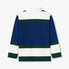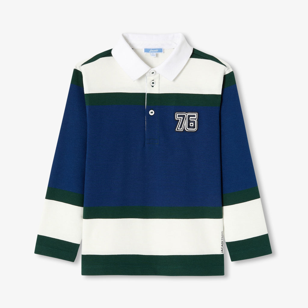キャンパス風のラガーポロシャツ。ススポーティーでカラフルなプレッピースタイルを演出します。柔らかく着心地の良いヘビーコットンのジャージー素材を使用しました。アシンメトリーなストライプがモダンです。ジャカディブランドの誕生年である"76"の刺しゅうバッジ付き。ベロアパンツやスウェットパンツと合わせて、普段着やスポーツシーンにもぴったりです。