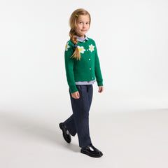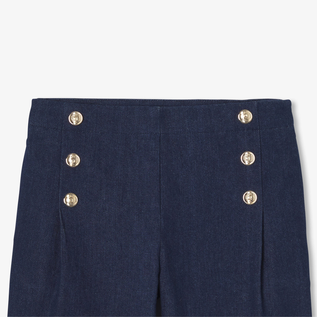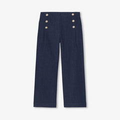 ワイドレッグとローブルーデニムを採用した、プレッピーシックなジーンズ。ゴールドのボタンが付いたタブパンツからインスピレーションを得た、万能でおしゃれなマストアイテムです。Tシャツとお揃いのジャケット(別売り)に合わせて、通園・通学に。