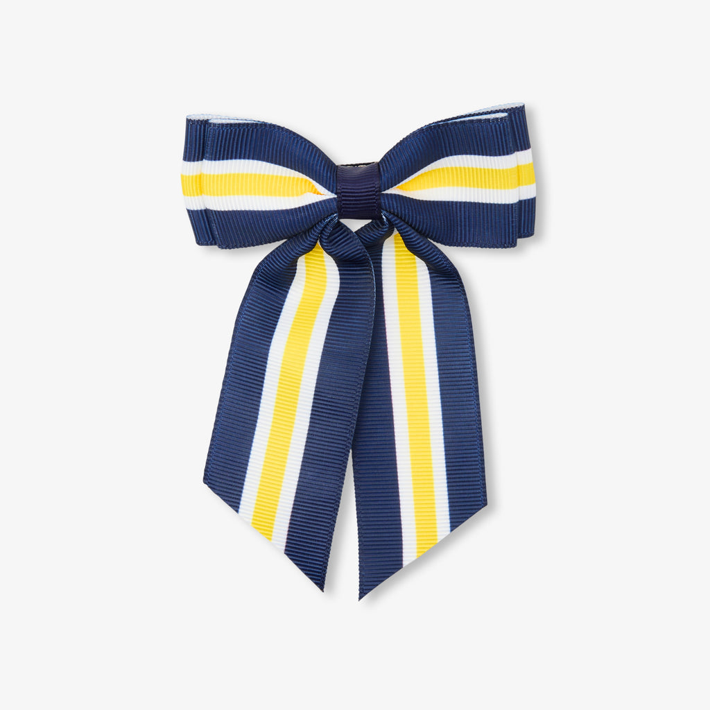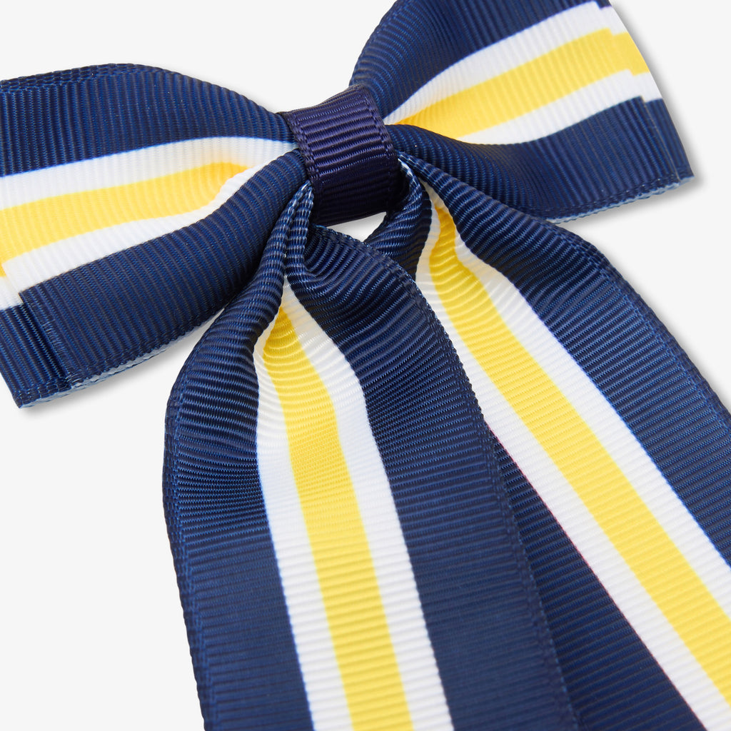 ハーフテールやポニーテールをエレガントに仕上げる大きめのヘアクリップ。ネイビーのグログランにイエローとホワイトのストライプのダブルリボンがあしらわれています。普段の装いに幾何学的なアクセントを。