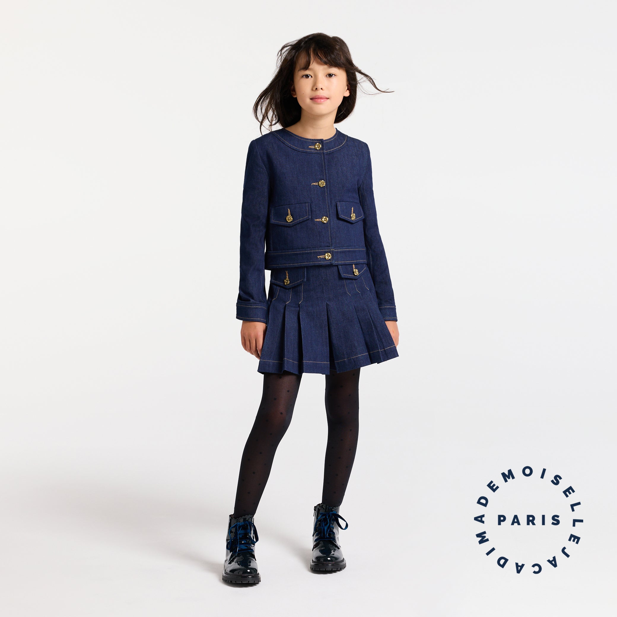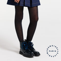 繊細な透け感と、ぷっくりと浮き上がったドット柄(プルムティ)が、足元に軽やかでモダンな表情をプラスします。リジッドデニムのドレスやキュロットに合わせて、洗練された冬のスタイリングを完成させて。