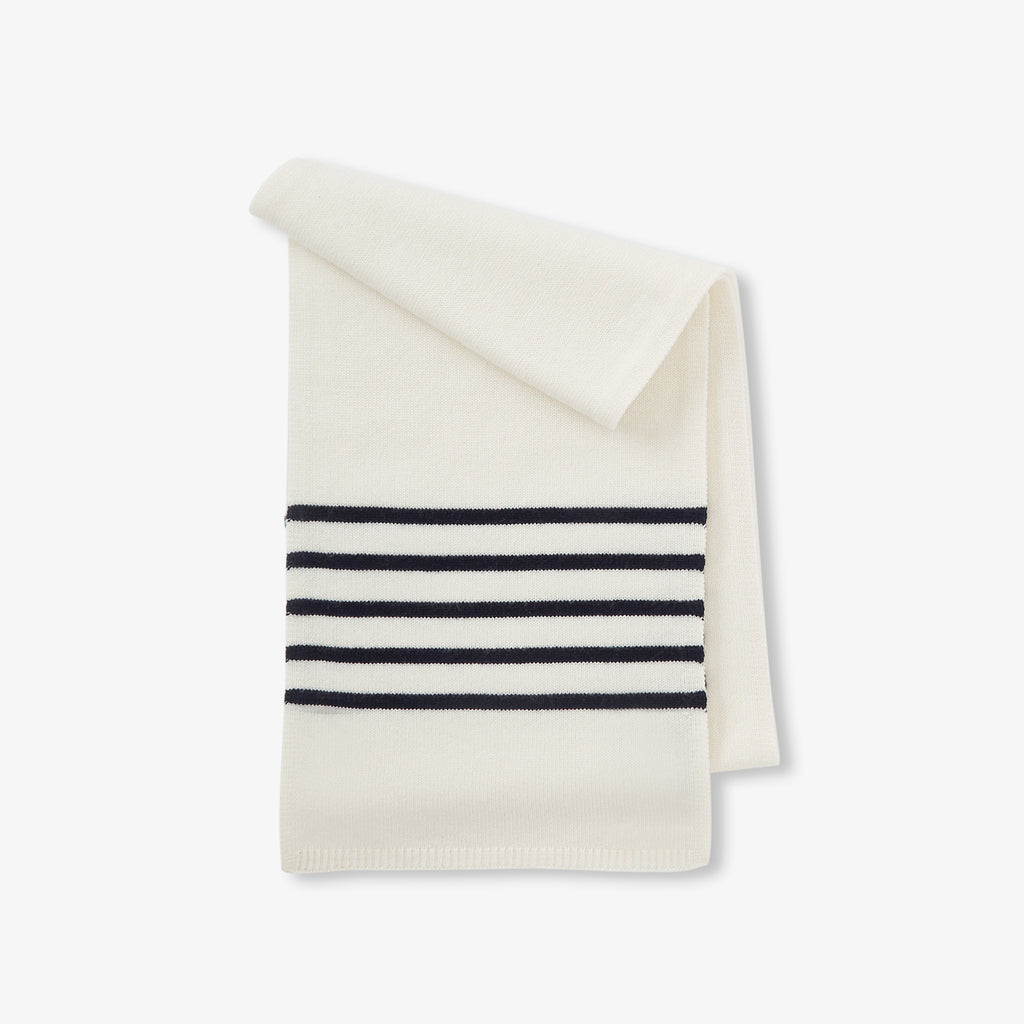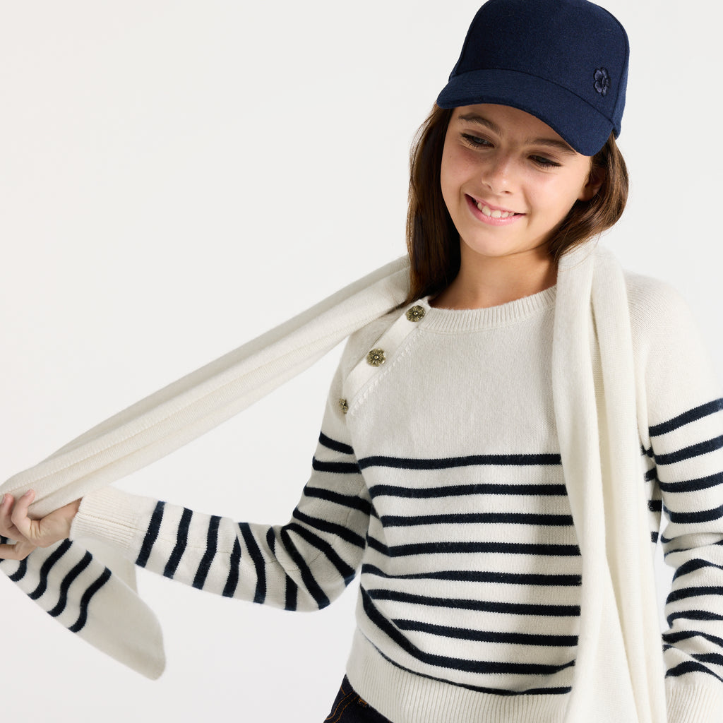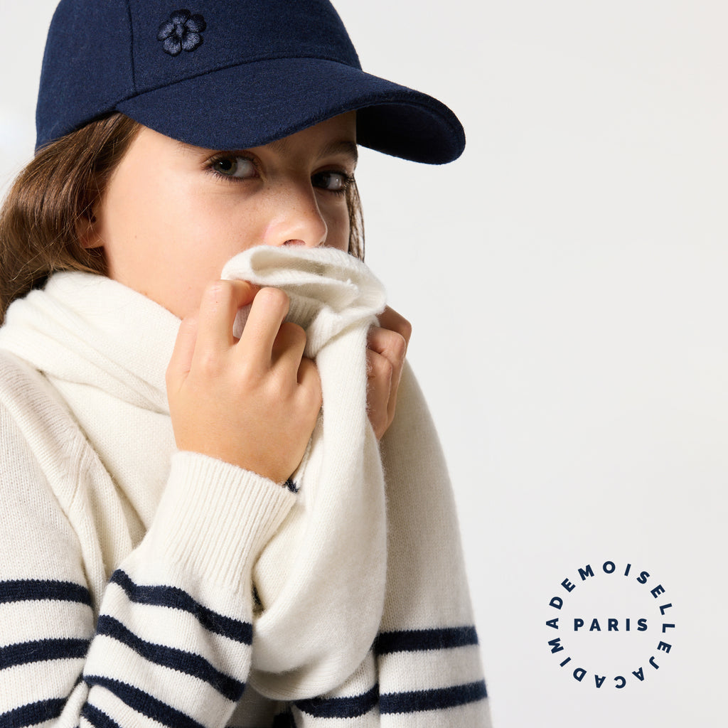 両端に配したマリン調のボーダーが、洗練されたモダンなアクセント。自分らしいスタイルを大切にする女の子たちの心を、一瞬で捉えてしまうはず。カシミヤならではの極上の肌触りと暖かさが、冬のお出かけをより特別なものにしてくれます。