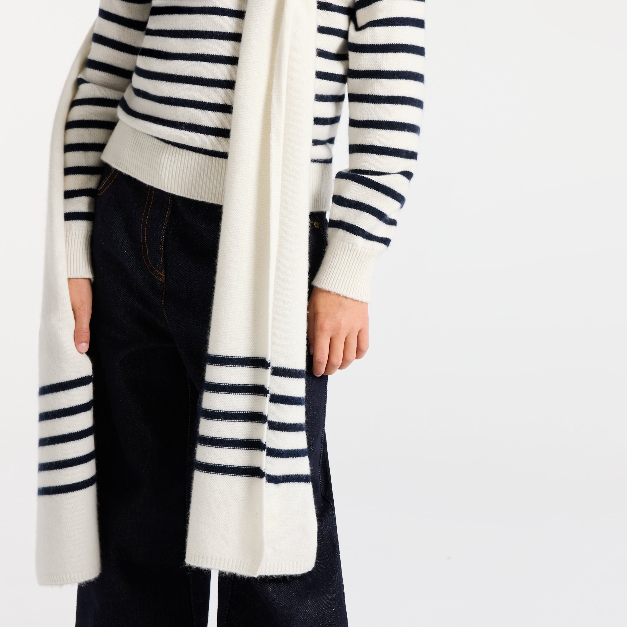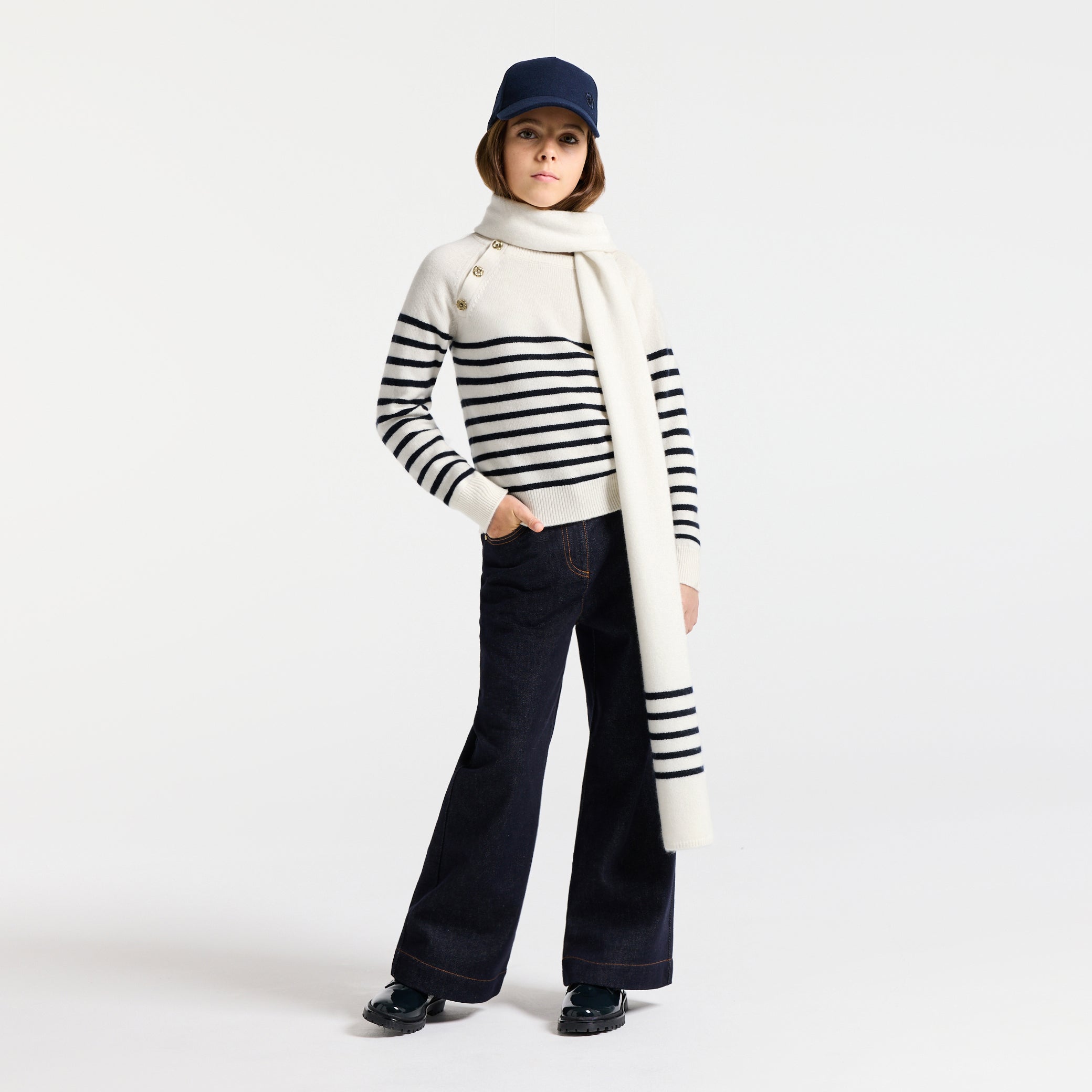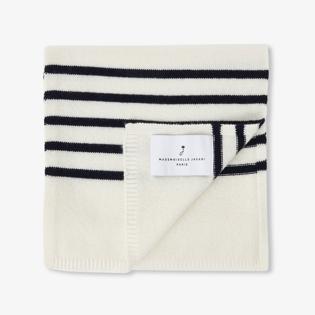両端に配したマリン調のボーダーが、洗練されたモダンなアクセント。自分らしいスタイルを大切にする女の子たちの心を、一瞬で捉えてしまうはず。カシミヤならではの極上の肌触りと暖かさが、冬のお出かけをより特別なものにしてくれます。