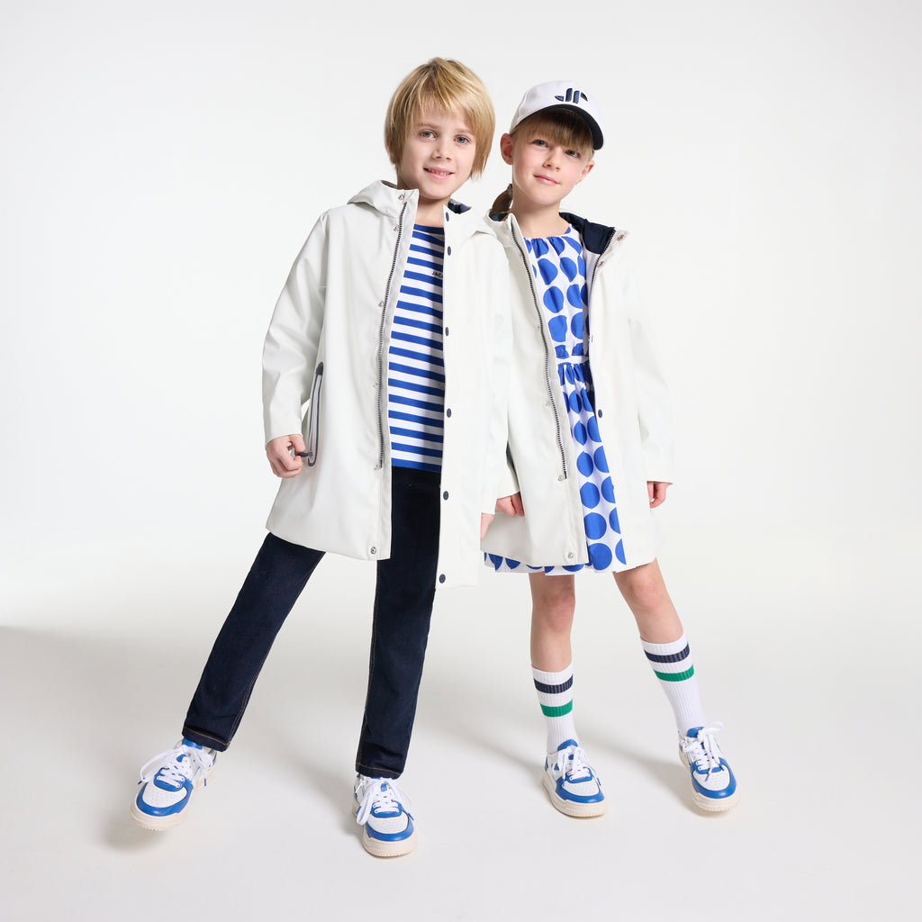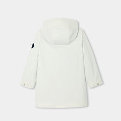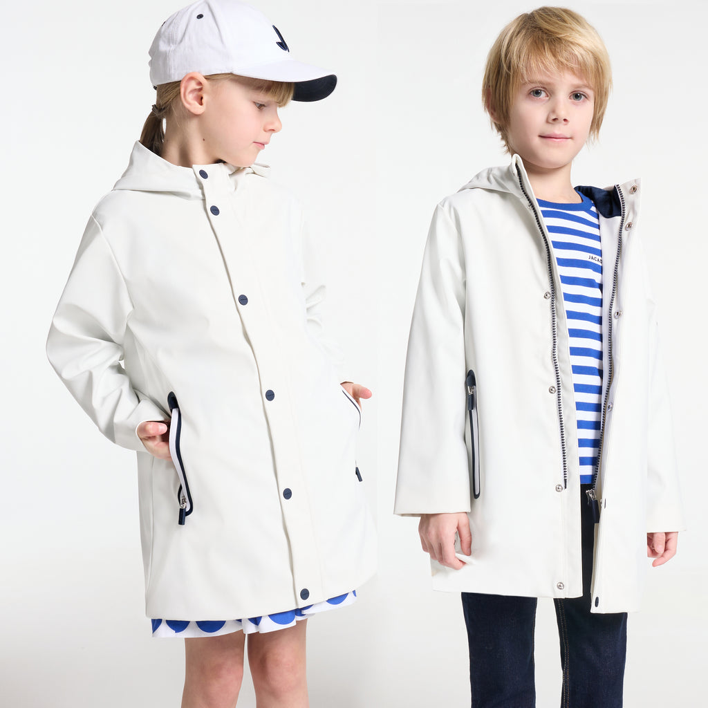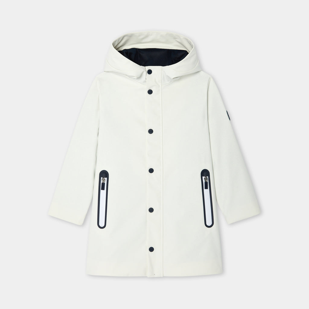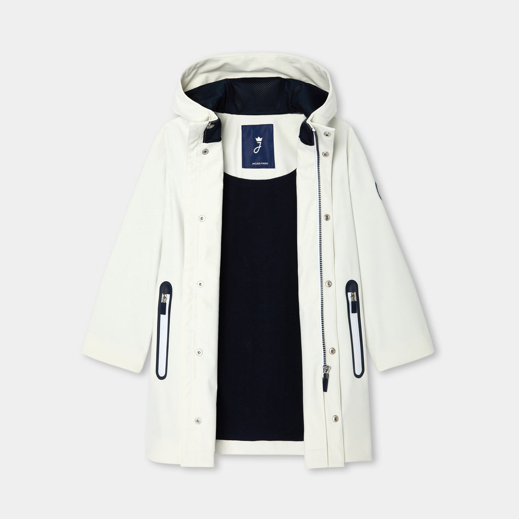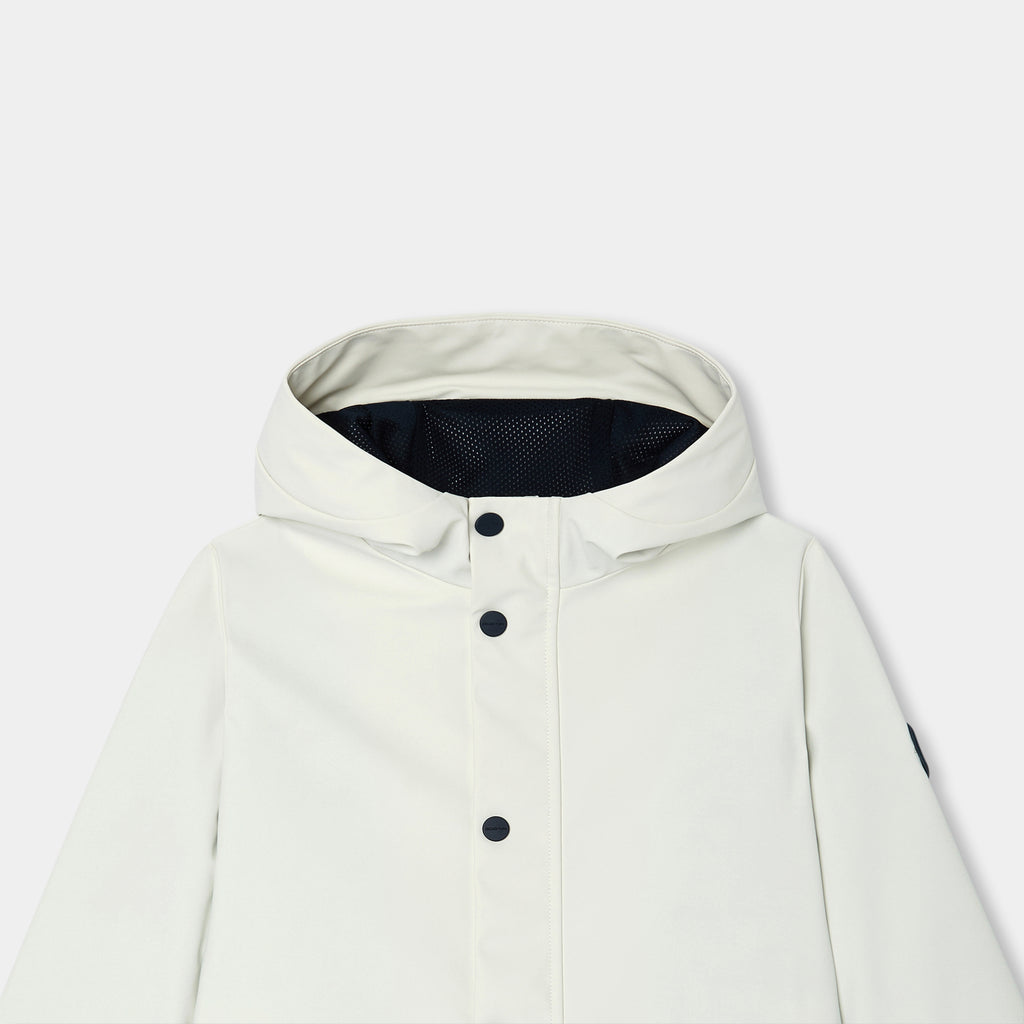 デイリーユースしやすい、都会的なロング丈のパーカー。撥水加工のウィンドブレーカーで、ジャージー裏地、メッシュの裏地付きフード、縁取りのジップポケットがポイントのモダンな一着です。ファスナーとスナップボタンで開閉でき、スウェットの上に羽織れば、お天気の悪い日も快適に過ごせそう。