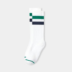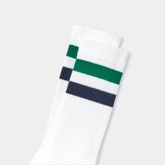 脱げにくいテクニカルメッシュ素材を使用したスポーツソックス。ストライプデザインがおしゃれな履きやすいミドル丈のアイテムです。ジョガーパンツやフリースショートパンツを合わせてモダンなコーディネートを楽しめそう。