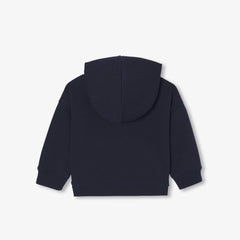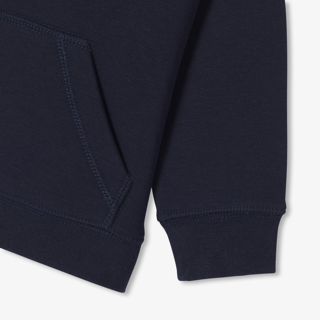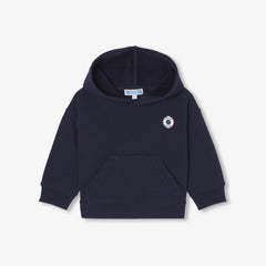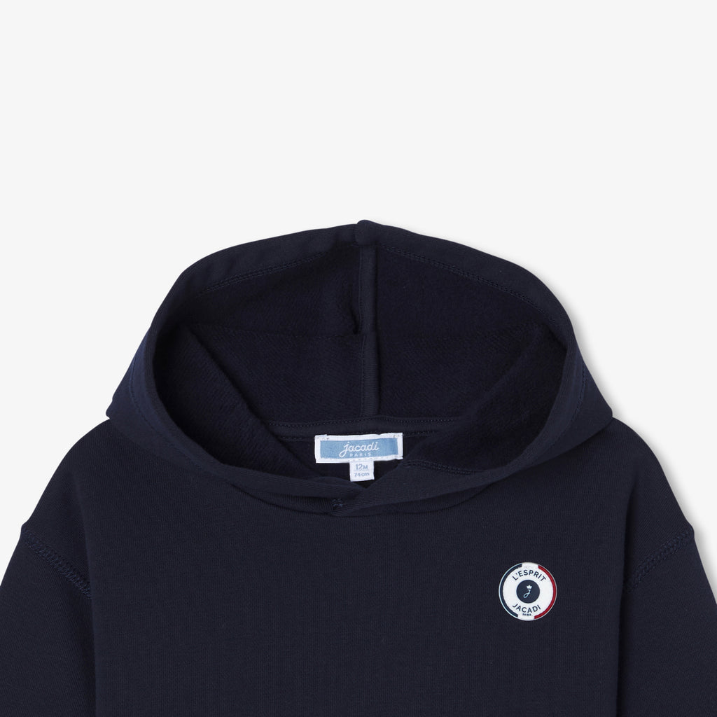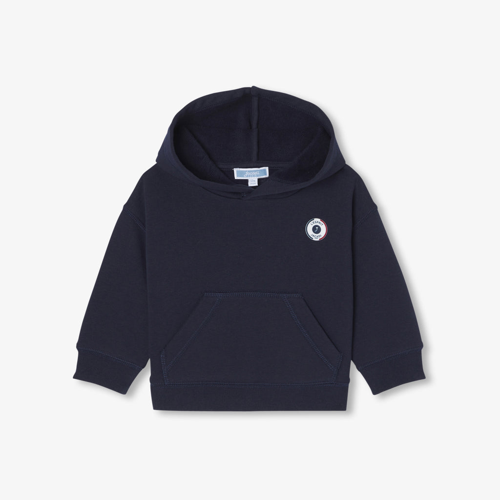 柔らかなフリース素材を使用したフード付きパーカー。快適さと都会的なスタイルを兼ね備えています。カンガルーポケットとジャカディの刺しゅうバッジをあしらいました。街中でも保育園でも着られる一着です。汎用性の高い定番アイテム。Tシャツにジーンズ、スニーカーを合わせて。