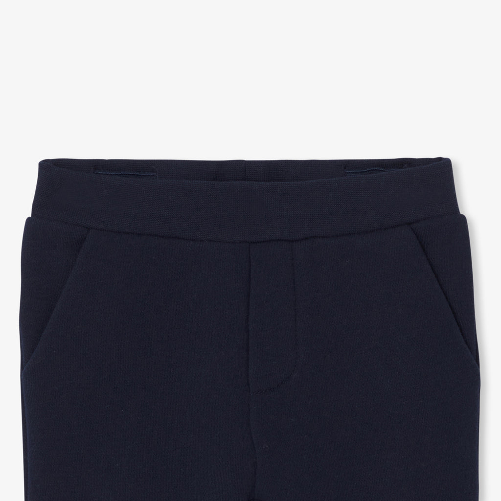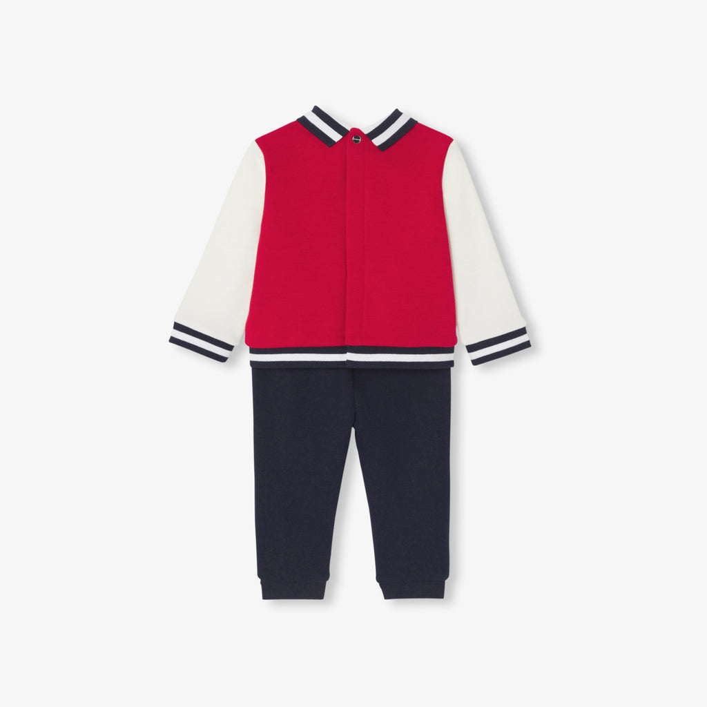 スポーティーでシック、そしてカジュアルなフリースのアンサンブル。ストライプのポロ襟スウェットと伸縮性のあるウエストゴム入りのパンツが上下セットになったフレンチルックなアイテムです。通園にはスニーカーを合わせて。