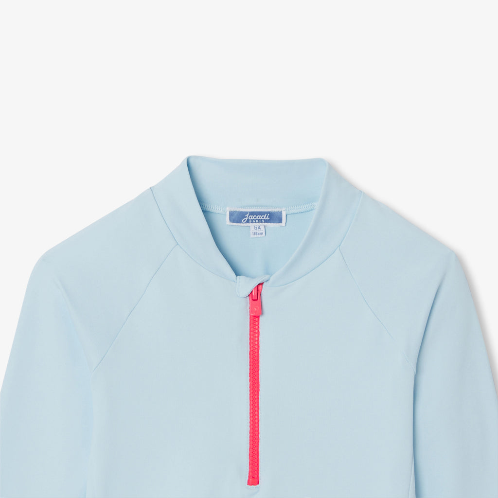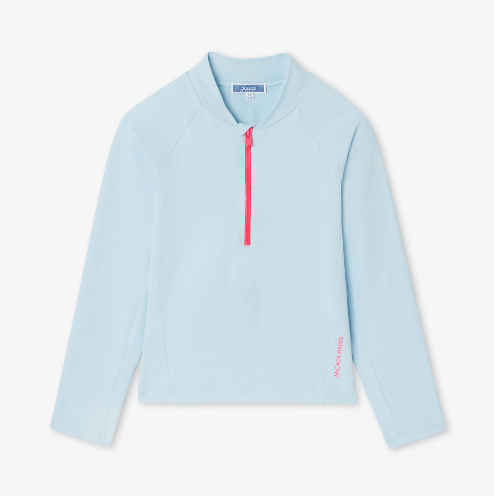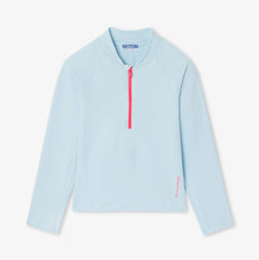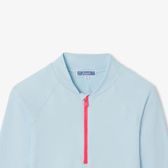 バカンスの必需品、UPF 40+のラッシュガード。鮮やかな色合いとカラーブロックデザインがおしゃれで、ネックラインのファスナーで開閉できます。ビーチやプールではプリント入りのスイムパンツを合わせて。