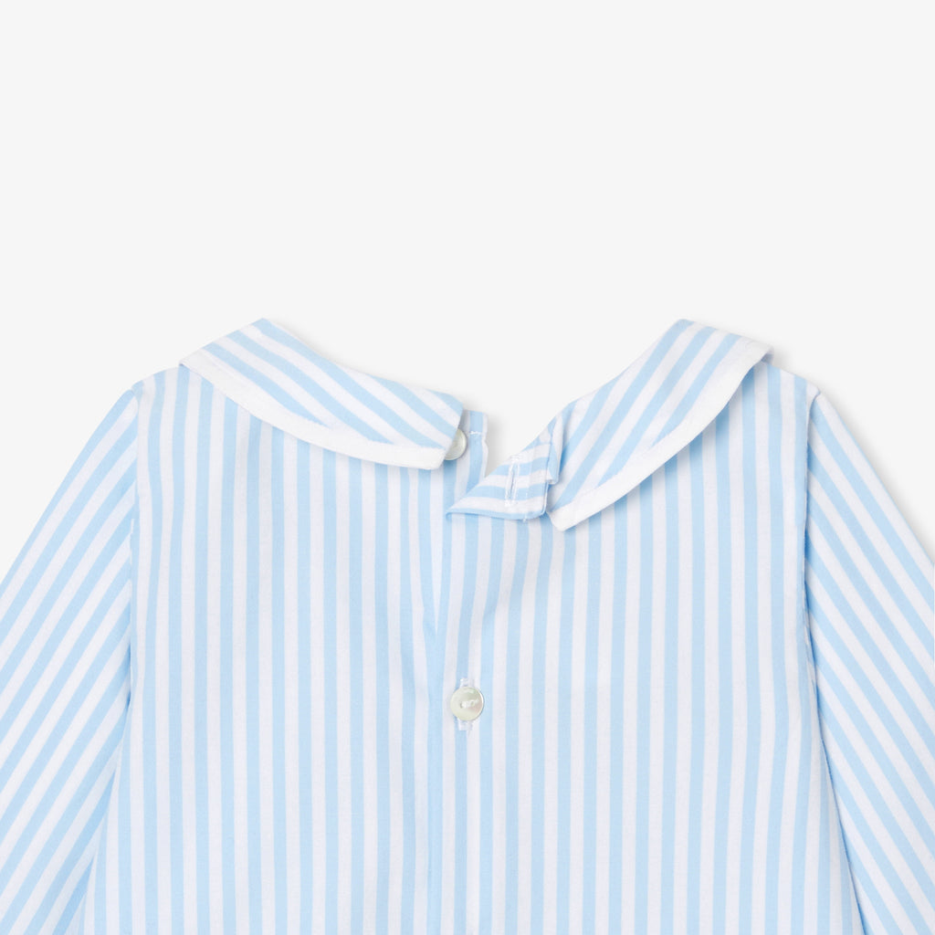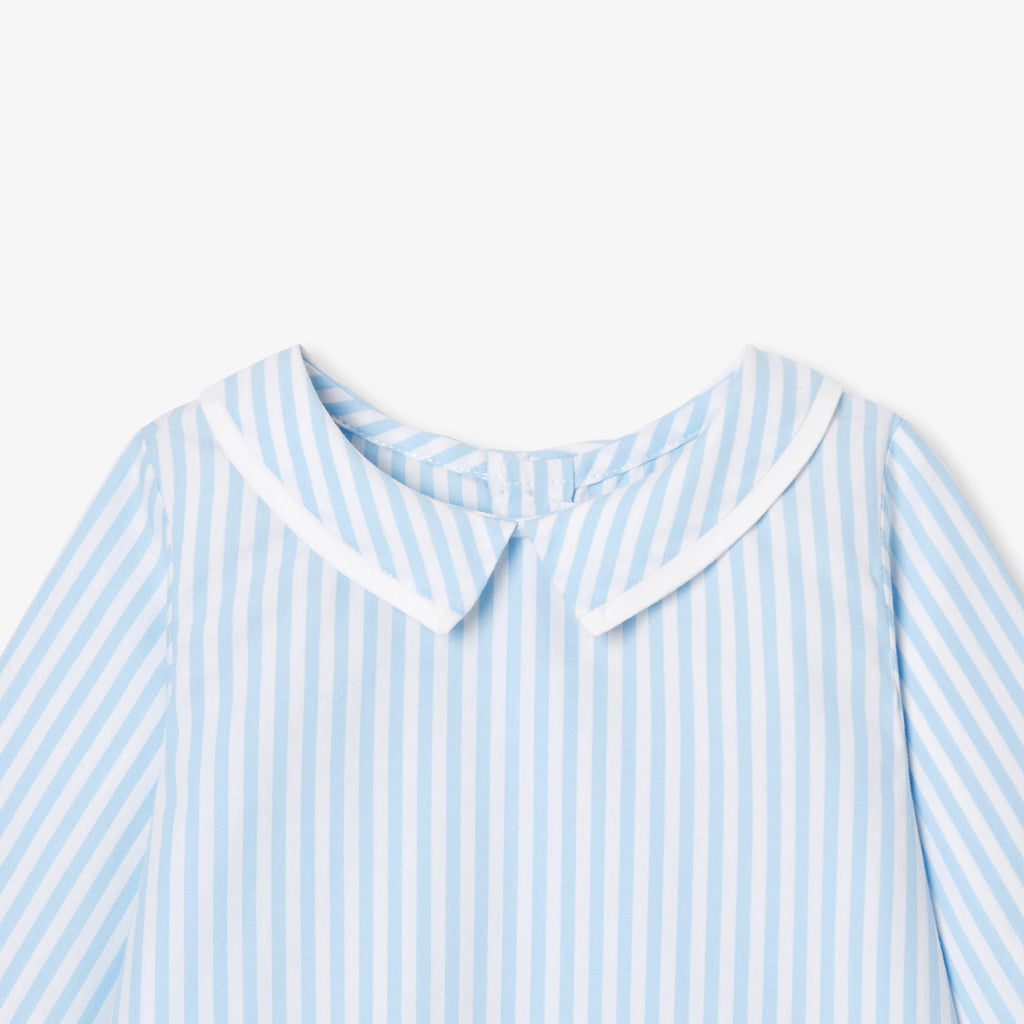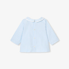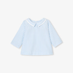日常の装いをシックに彩るストライプシャツ。柔らかでしなやかなオーガニックコットンポプリンを使用しており、小さな襟がアクセントになっています。背面のボタンで開閉でき、ジーンズやサロペットとも相性抜群。今シーズン大活躍の予感です。