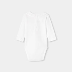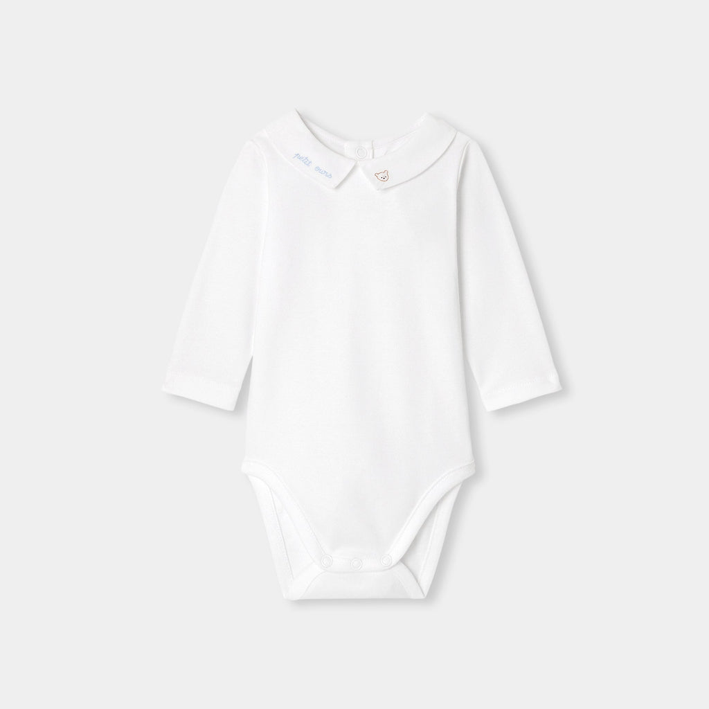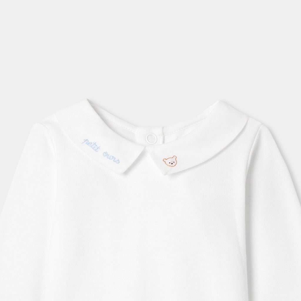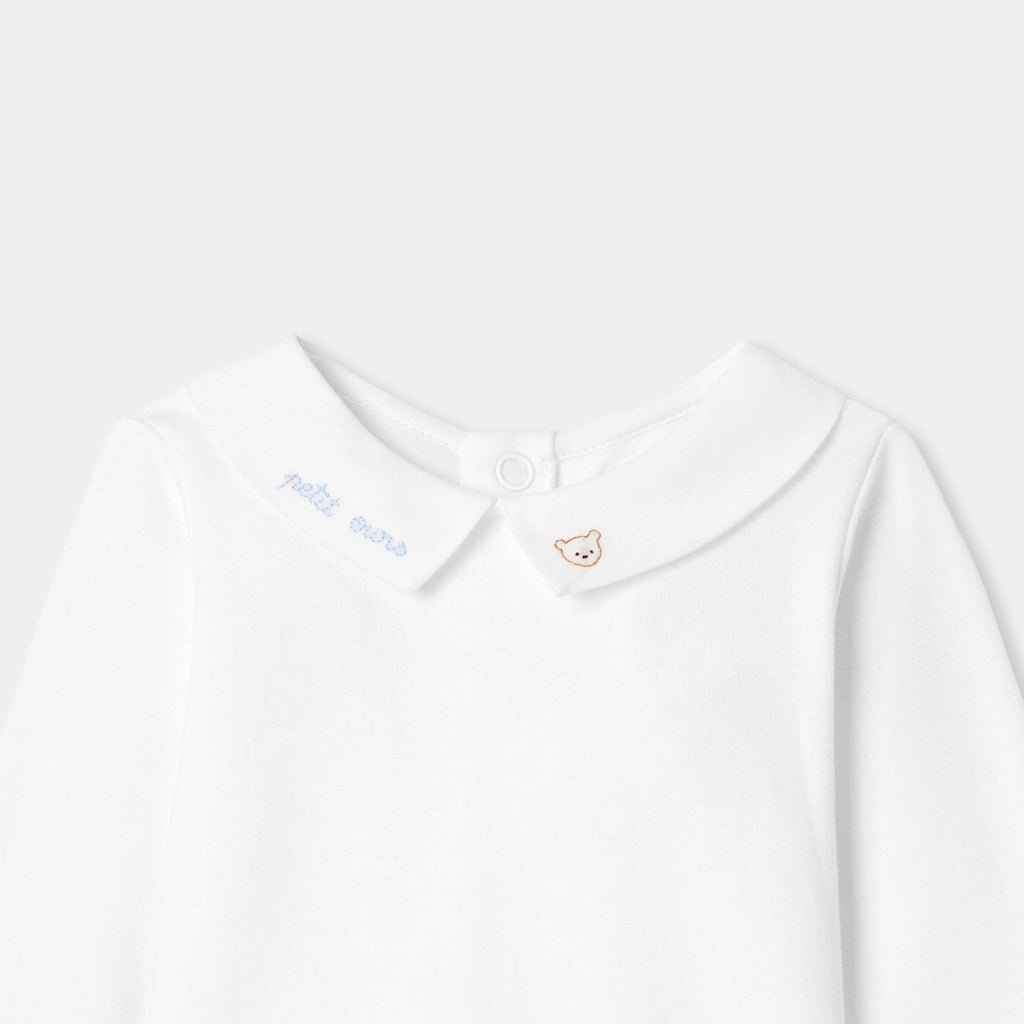 オーガニックコットンを使用した長袖ボディスーツ。手刺しゅうのテディベアと文字デザインをあしらったポプリン襟がキュートなモデルです。サロペットやニットアンサンブルと合わせやすく、ファーストセットにぴったり。