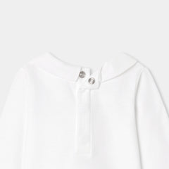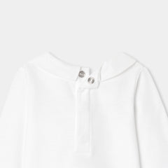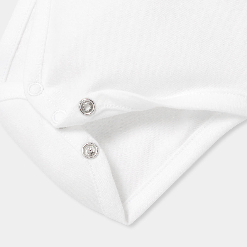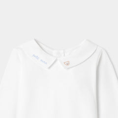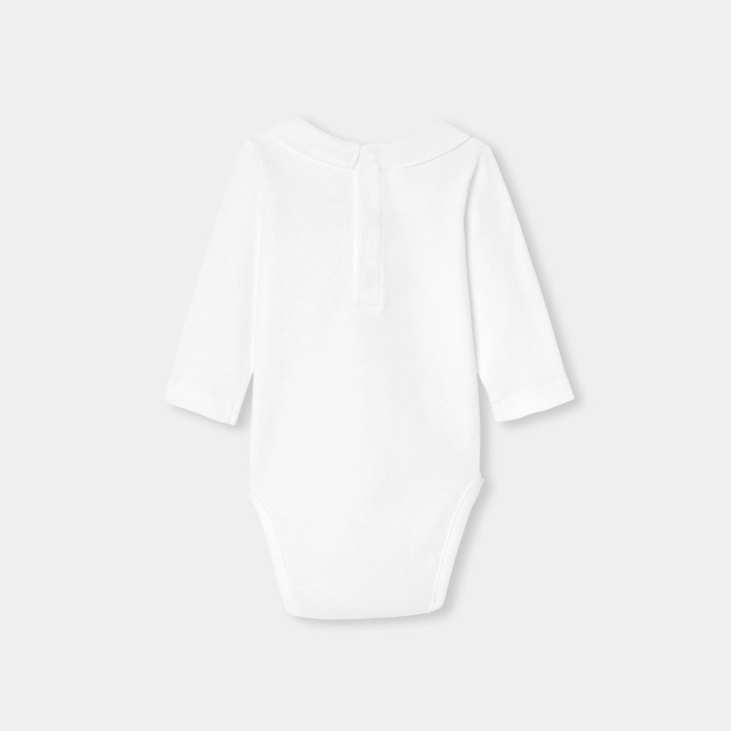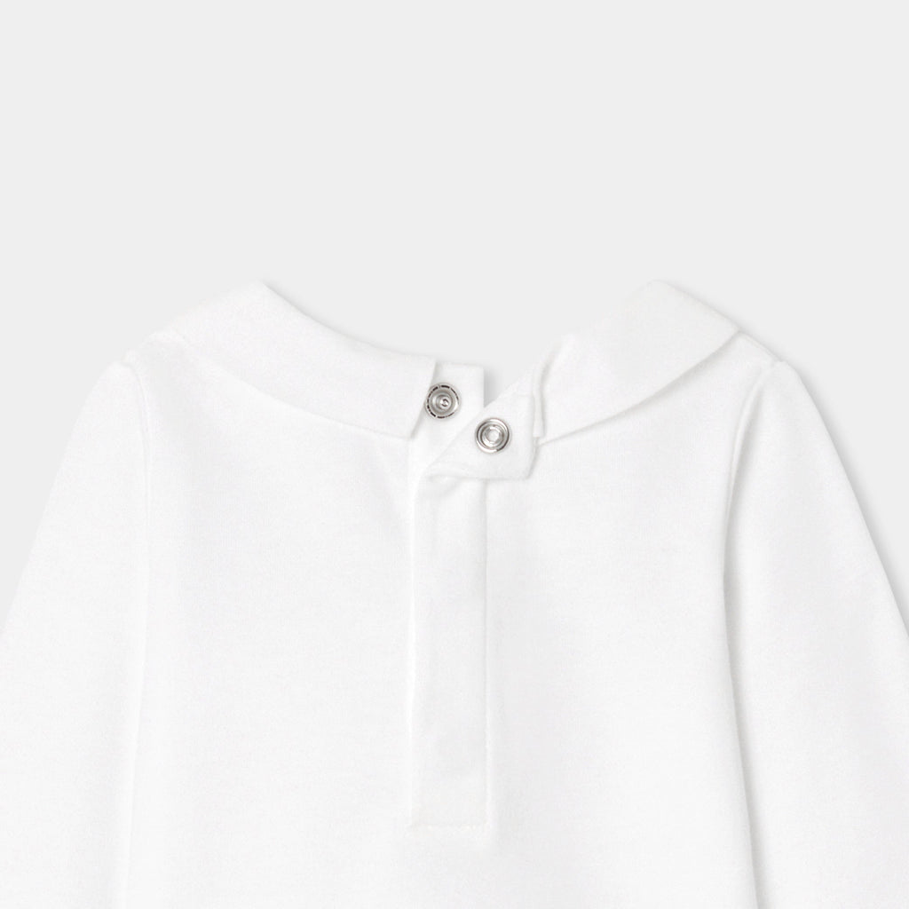 オーガニックコットンを使用した長袖ボディスーツ。手刺しゅうのテディベアと文字デザインをあしらったポプリン襟がキュートなモデルです。サロペットやニットアンサンブルと合わせやすく、ファーストセットにぴったり。