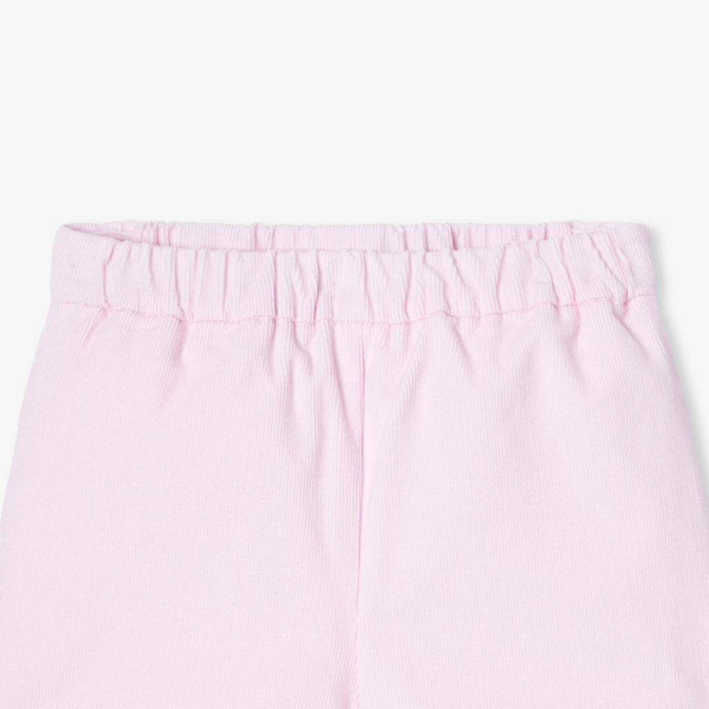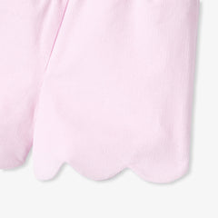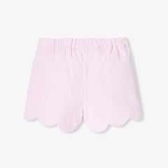 ベロア調生地のショートパンツで、陽気でカラフルな毎日を。シックでモダンなパウダーピンクのスカラップデザインに、フラワー型のポケットがあしらわれています。裏地付きで、伸縮性のあるウエストにゴム入りなので着脱も簡単。リバティプリント(花柄)のブラウスやカーディガンと合わせて。