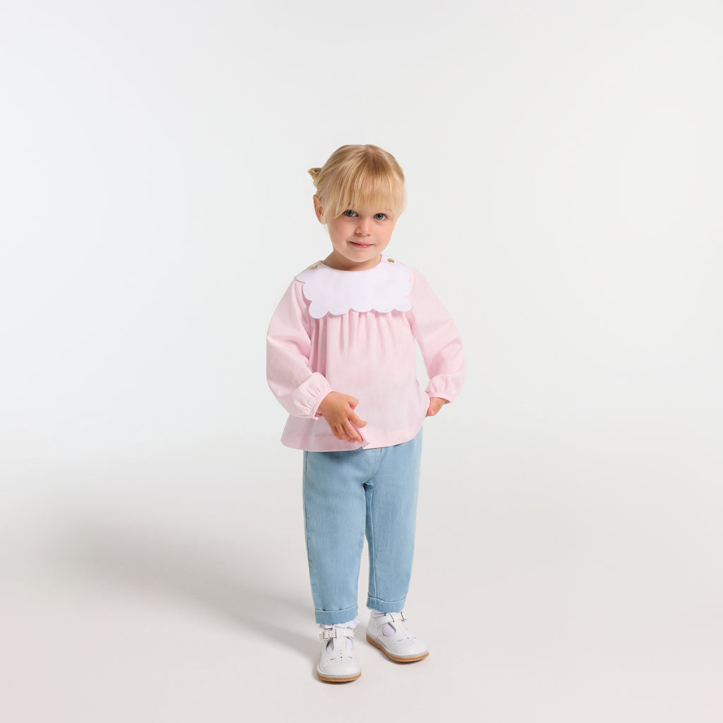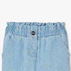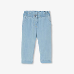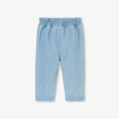くすみキャンバス地を使用した、ワードローブの定番ジーンズ。ペーパーバッグウエストとキャロットカットが特徴です。伸縮性のあるウエストゴム入りで実用的。Tシャツやブラウス、スウェットシャツにぴったりです