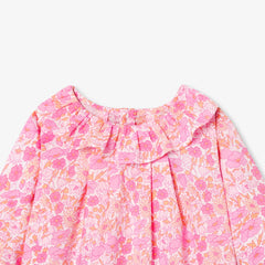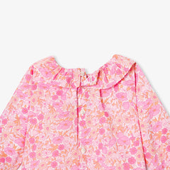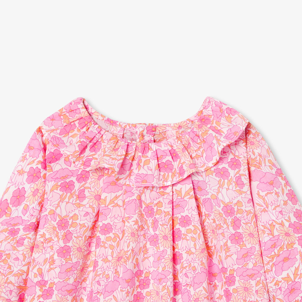 時代を超越したエレガンスと、柔らかな着心地の良さを兼ね備えたリバティプリント(花柄)のポプリンブラウス。フリルと前後のプリーツによるボリューム感がキュートです。背面のボタンで開閉でき、着脱も簡単。毎日の装いにロマンチックなタッチを添えてくれます。