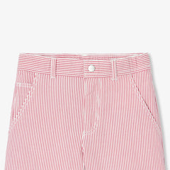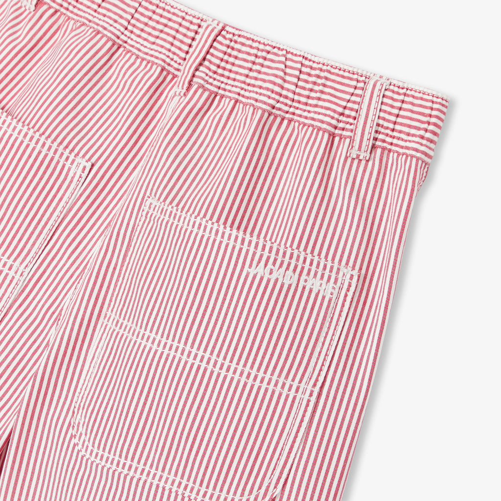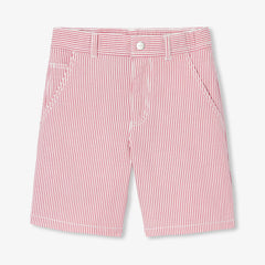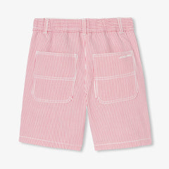 シックな海辺の雰囲気がおしゃれなバミューダショートパンツ。ストライプデザインのコットンツイルを使用した印象的な一枚。街中や水辺で活躍する、フロッキー加工のTシャツやポロシャツと合わせやすい季節の必需品です。リラックスしたエレガンスをまとって、夏本番を楽しんで。