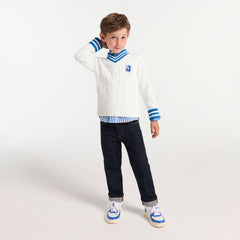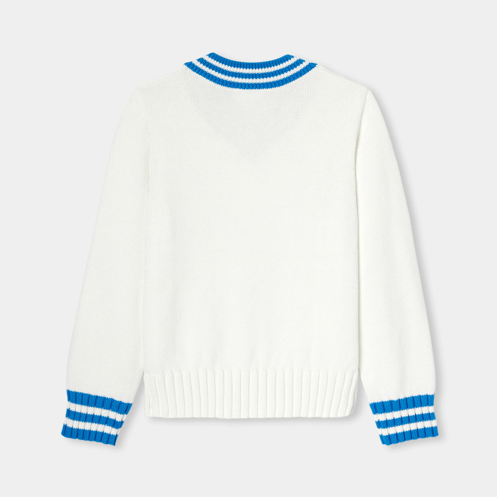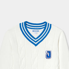 Vネックと袖口のストライプのリブが特徴的なクリケットセーター。新学期のワードローブに欠かせない存在となる一着です。厚手でエレガントなツイストニットに、胸元には"J"の刺しゅうバッジ付き。プレッピーな秋の装いが叶う、洗練されたデザインです。